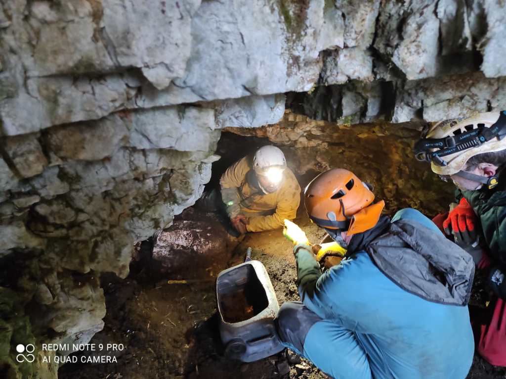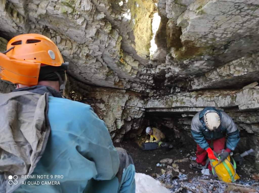 Sapete come vanno queste cose, spostiamo terra e sassi nemmeno fossimo talpe. Quando oramai siamo quasi tutti stanchi entra in azione Valentina. Si e’ risparmiata finora per dare il suo apporto decisivo in fine giornata. Mi affianco a lei e troviamo il modo di scavare insieme nello spazio limitato che abbiamo ricavato. Valentina pulisce una zona che rivela una bella spaccatura, stretta ma interessante. La roccia e’ compatta, si, ma si intravedono fratture che la rendono adatta al demolitore. E noi abbiamo giusto un demolitore nuovo nuovo che e’ ansioso di rendersi utile. Cambiamo la batteria e iniziamo a operare. Dopo qualche minuto Claudio si stufa di stare fermo e mi ruba il demolitore. Riesce a fare un buon lavoro, si intravede una piccola prosecuzione nella frattura. A tratti i miei amici affermano di sentire aria. Oggi per l’aria non e’ una buona giornata, la temperatura fuori e’ di circa 9°, la circolazione d’aria nelle grotte di queste parti e’ praticamente in stallo. Alla fine anche Valentina si cimenta col demolitore. Fanno subito amicizia! Continua a lavorare senza interruzioni. Claudio e Gabriele e’ parecchio che sono fermi, accusano freddo. Alla chetichella prendono la via per l’esterno dove la temperatura e’ piu’ confortevole. Io rimango a fare da spalla a Valentina, insieme commentiamo su quali siano i punti migliori da attaccare col demolitore. Quando anche la seconda batteria si esaurisce lo prendiamo come un segnale. E’ ora di andare via. Ora che l’interesse per lo scavo va scemando mi accorgo di avere i piedi completamente ghiacciati. Quando mi alzo in piedi faccio fatica e tenermi in equilibrio, devo fare piu’ attenzione. Valentina inizia a salire mentre cerco di recuperare una parvenza di sensibilita’ ai piedi. Qualche passo incerto su e giu’ per lo sgrottamento e va gia’ meglio. Seguo Valentina. Mi fermo un attimo per togliere la corda e poi proseguiamo tutti assieme. Fa ancora una temperatura piacevole ma il sole e’ quasi all’orizzonte e quando calera’ la temperatura diventera’ piu’ rigida in pochi minuti. Meglio sbrigarsi. Faccio solo una rapidissima deviazione a Bucio Nero’ per vedere cosa ne sia stato degli stecchi di incenso. Sono ancora la’, probabilmente si sono spenti subito, e’ troppo freddo per loro. Dovremo trovare altro.