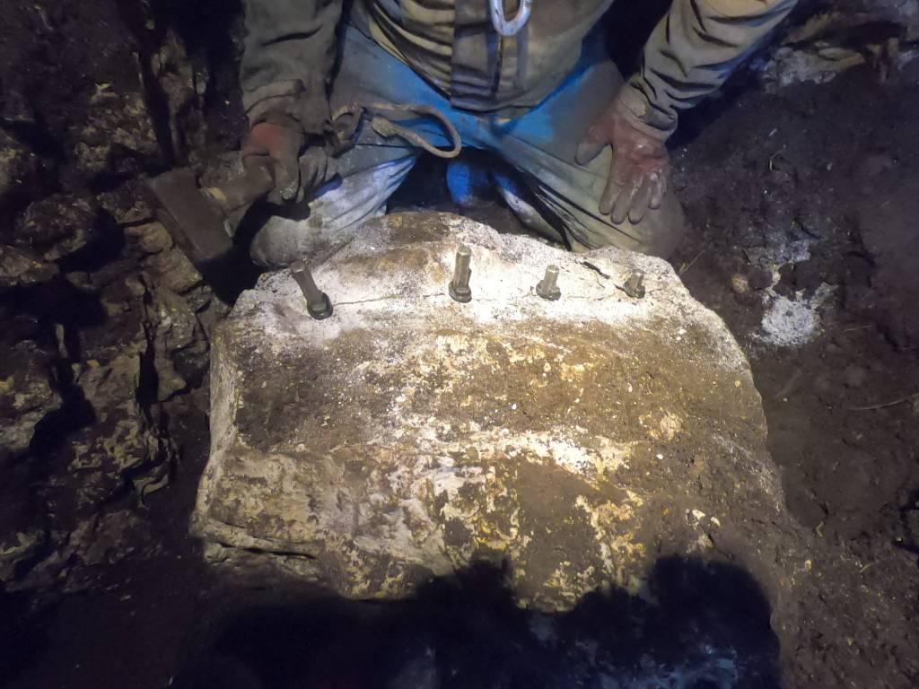 La zona scavi e’ ostruita da un masso enorme, proviamo a spostarlo in 2 ma non accenna nemmeno. La decisione e’ unanime, e’ il momento dei punciotti! Dedichiamo un minuto ad ammirare il trapano nuovo. Ci litighiamo appena appena per trovare il modo per bloccare la punta sul mandrino e poi prepariamo i protagonisti, i punciotti. La prima serie di fori la faccio io, sistemiamo i punciotti ed iniziamo a martellare, un poco Claudio, un poco io. Non ci vuole poi molto per sentire il delizioso scricchiolio della roccia che si frattura. Alla fine, proprio perche’ questa cosa ci piace un sacco dividiamo il pietrone in 6 parti con un totale di 5 tagli e 18 buchi da 14mm. I punciotti hanno fatto un figurone, ma anche il trapano si e’ comportato molto bene.