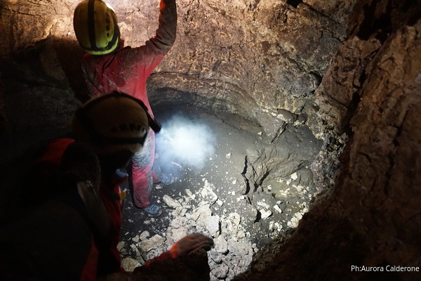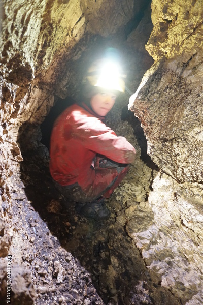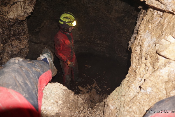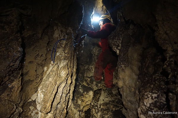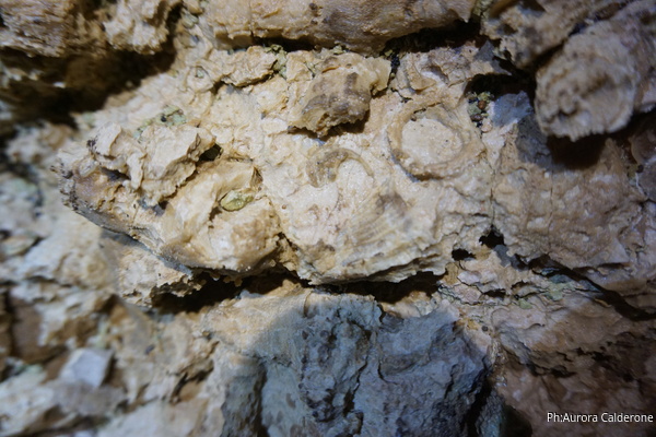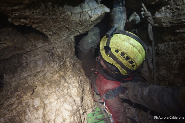 Oggi e’ Aurora che si dedica alle foto. Ha portato la sua fotocamera professionale perche’ e’ stata all’unanimita’ incaricata dal gruppo di fare un bel servizio fotografico sulla parete di rudiste. Oggi quindi lavoreremo su 3 fronti. Aurora e Gabriele dapprima a fare le foto e a dare uno sguardo all’ambiente in alto sopra alla risalita iniziale, Angelica ad allargare il foro d’ingresso al pozzo del fango (chi ha letto la precedente relazione sa di cosa parlo!), io dalla parte opposta ad allargare il passaggio per il pozzo da scendere.