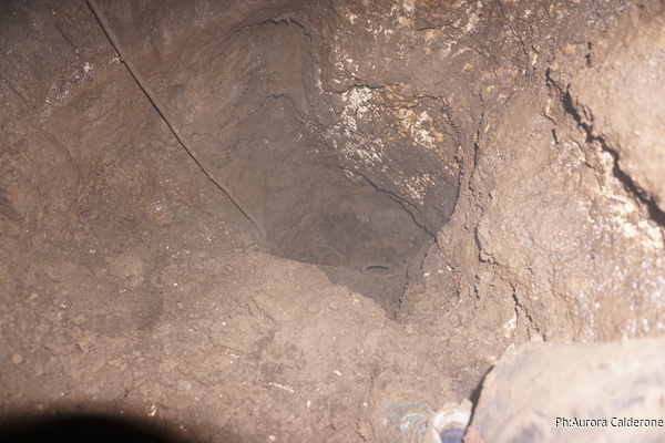 Nel frattempo Aurora e Gabriele terminano il loro lavoro fotografico, richiamati da Angelica, vanno a vedere il da farsi nel pozzo del fango. Come immaginavo il punto piu’ promettente dove scavare e’ quello a destra del foro d’ingresso. I miei amici iniziano a scavare con impegno
