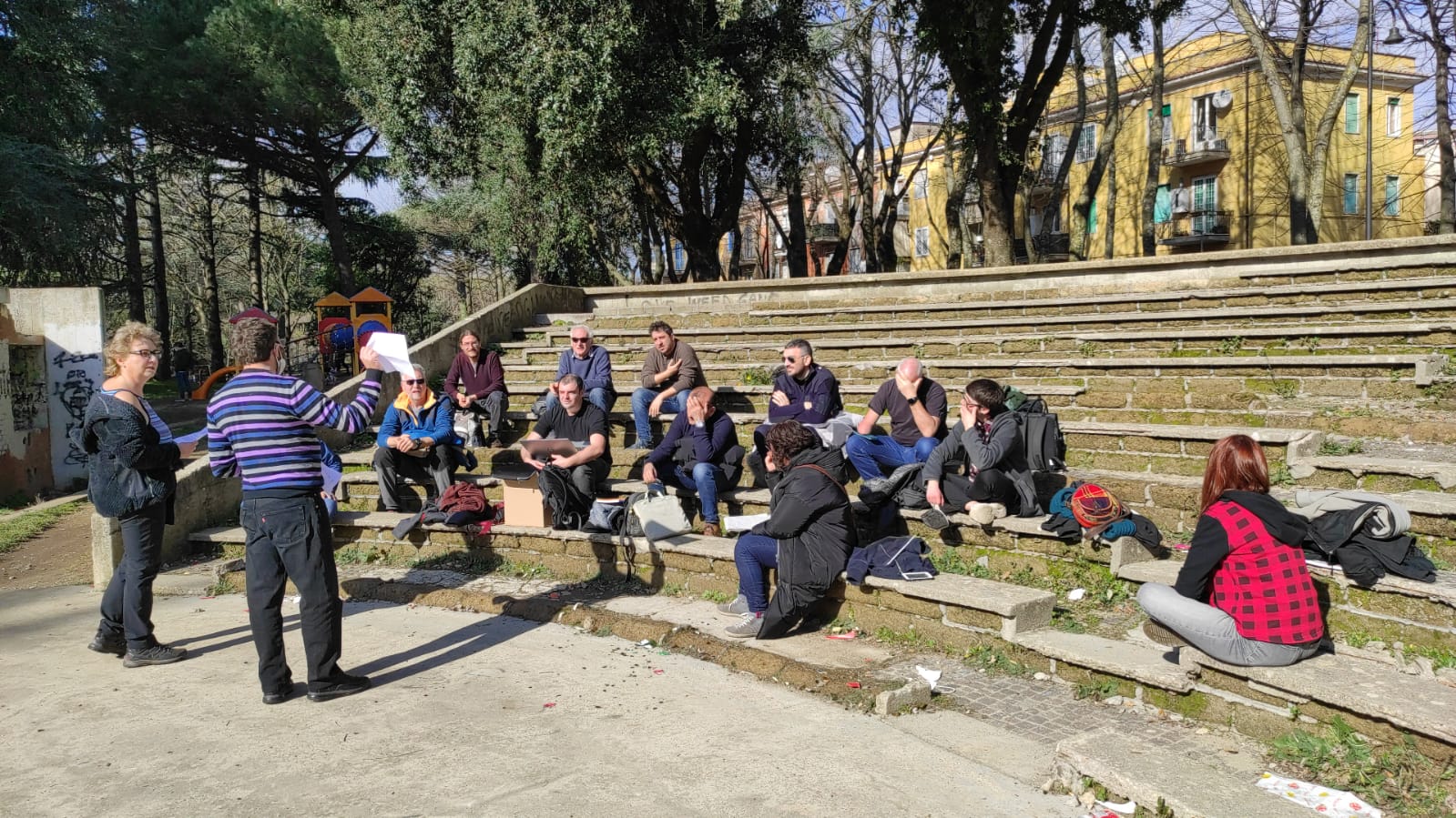 La riunione si e’ tenuta a Genzano, in quello che viene chiamato “teatro” all’aperto. Forse lo e’ stato in passato, ma ora versa in pessime condizioni. Almeno il tempo e’ stato clemente e tutta la riunione e’ stata accompagnata da un bel sole.