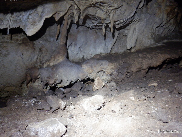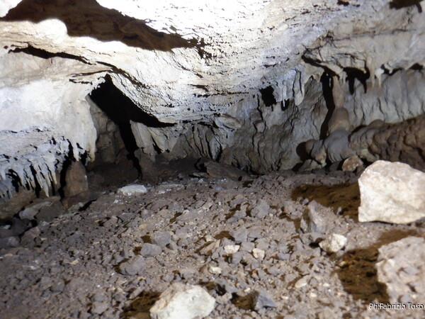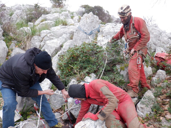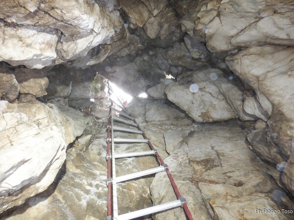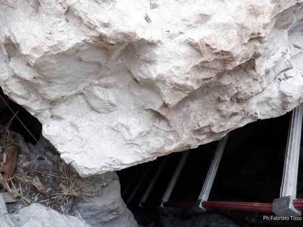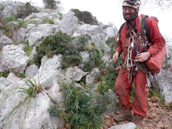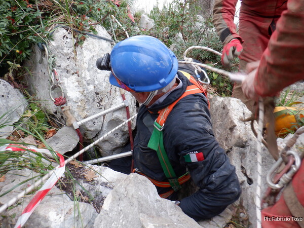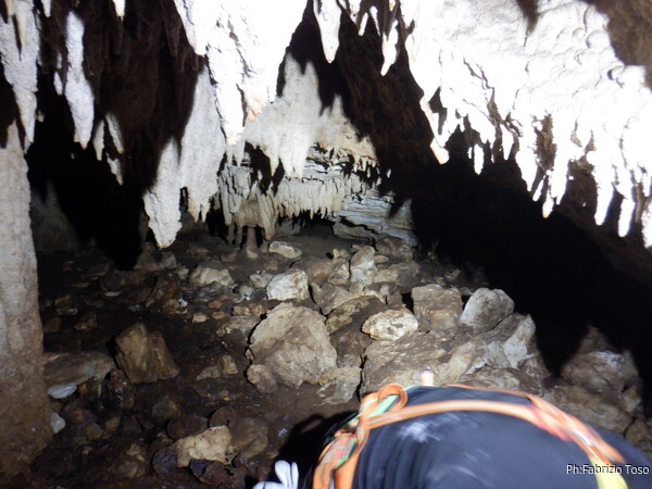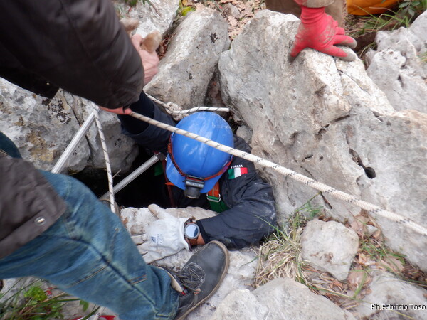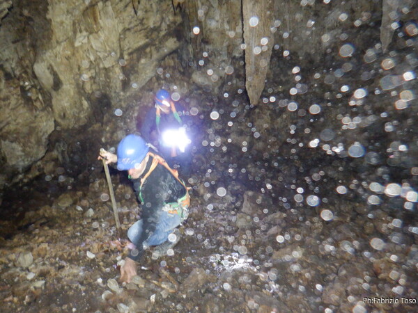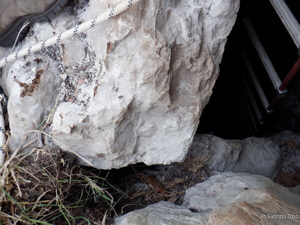 Nulla di male, con poca fatica lo facciamo rotolare via. E’ il nostro momento, io mi occupo di allargare l’ingresso con i punciotti mentre Giuseppe e Gabriele sistemano le corde di servizio.