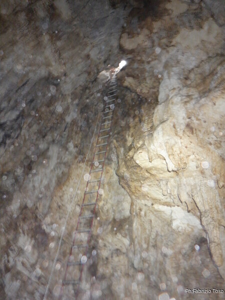 Recuperato il materiale iniziano ad uscire anche i tecnici. Mentre salgono con la scaletta, facciamo loro sicura con la corda.