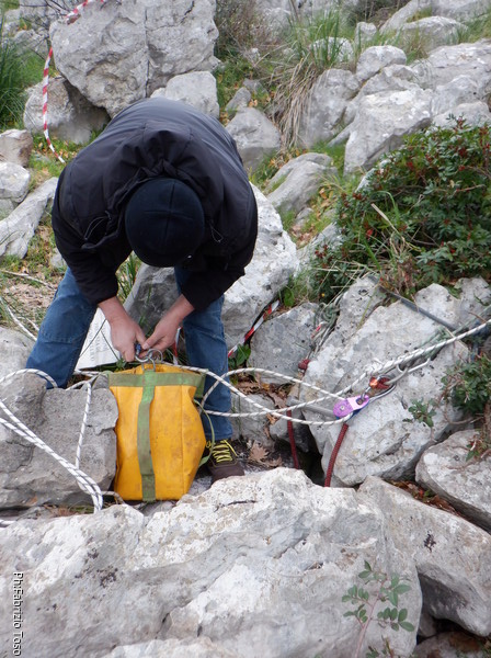 I militari che visiteranno la grotta hanno portato una scala, decidiamo di sistemarla cosi’ la potranno utilizzare per salire e scendere, le nostre corde le useremo solo per far loro sicura ed eventualmente fare passaggio di materiali.