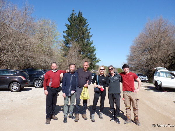 Con Gabriele ad esplorare una nuova grotta. La mattina arriviamo a Pian della Faggeta pronti al cimento. Al parcheggio incontriamo un bel gruppo di amici che si preparano per una visita alla celebrita’ della zona, la grotta di Pozzo Comune. Prima di salutare i nostri amici e proseguire e’ d’obbligo una foto tutti assieme.