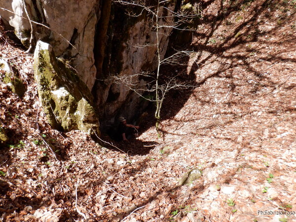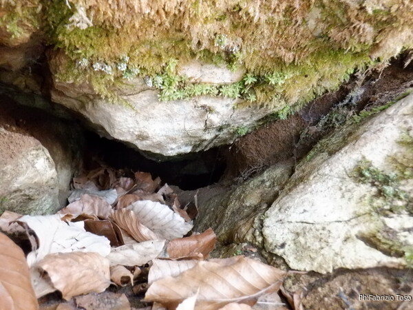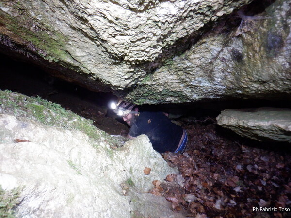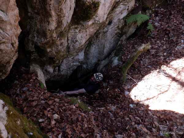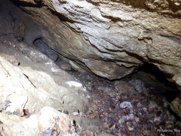 Sistemato il GPS entro a mia volta. La nostra grotta non e’ molto alta, e’ uno scivolo tappezzato alla base da un comodo letto di foglie. Ai lati ci sono degli ambienti che vedremo poi con calma.