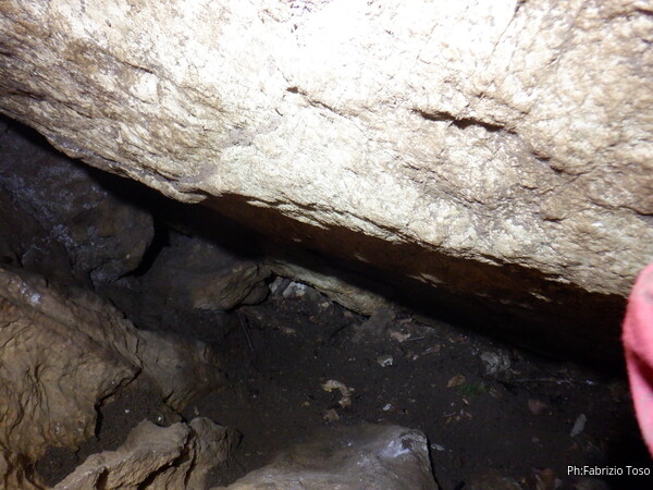 Sempre in fondo, sulla destra c’e’ una nicchia, non sembra promettente come il pertugio stretto ma almeno qua riesco a scavare. Decido di dargli una chance e mi metto a scavare la’. Gabriele, piu’ capoccione di me, insiste sul pertugio dandosi a sua volta per vinto dopo qualche minuto. Viene a darmi una mano nella spostare sassi e pattume dove ho deciso di scavare. Quando poggiamo un sasso abbastanza pesante il pavimento vibra sensibilmente. La sensazione e’ quella di trovarsi su un diaframma di rocce di crollo miste al materiale vario scivolato giu’ nel tempo dall’ingresso.
