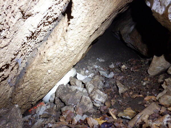 Sul fondo la grotta chiude con terra, sassi e pattume vario. Si intravede un buco che ci da’ qualche speranza. Peccato stia in un posto troppo stretto per entrarci. Sono capoccione quindi decido di provare ugualmente. Mi infilo nello stretto, raggiungo il buco ma poi sono talmente incastrato che non posso muovere le braccia. Con molte imprecazioni e qualche sbuffo mi cavo fuori da quella posizione scomoda.