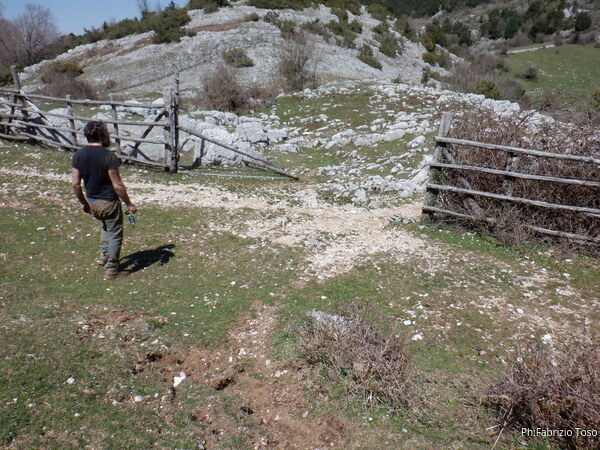 Giriamo un po’ senza trovare nulla. Ci fermiamo a ragionare e scavare nella memoria per trovare riferimenti che ci aiutino nella ricerca. Qualcosa troviamo. Le nostre doline erano nei pressi di un bucaccio nel terreno transennato con “cosi” metallici. Il recinto, ci sembra di ricordare, era sotto un grande albero e si vedeva dalla strada. Nei dintorni non c’e’, riprendiamo la macchina e continuiamo a salire alla ricerca del recinto. Eccolo! Parcheggiamo nuovamente, stavolta ritroveremo la nostra grotta. Ci addentriamo a piedi fuori sentiero per una nuova ricerca. Ci separiamo per abbracciare piu’ terreno nella ricerca. E’ Gabriele a trovarla, mi chiama e lo raggiungo. Si e’ proprio lei. Torniamo alla macchina, e’ a 2 passi, per prendere il materiale necessario.