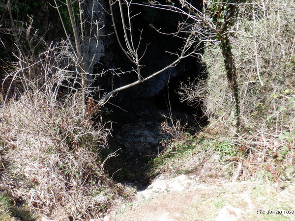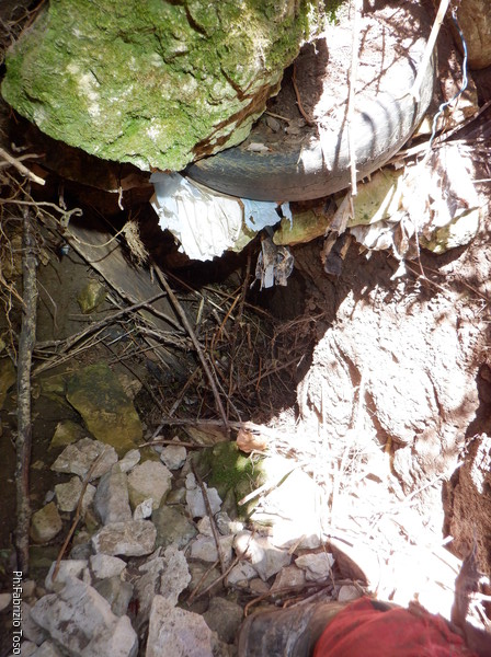 Prima di tornare alla macchina andiamo a dare uno sguardo nel punto in cui la volta scorsa abbiamo notato sparire parte dell’acqua del fiumiciattolo che alimenta la grotta. Trovo il punto ma e’ invaso da pattume di ogni tipo. Lasciamo perdere.