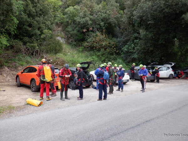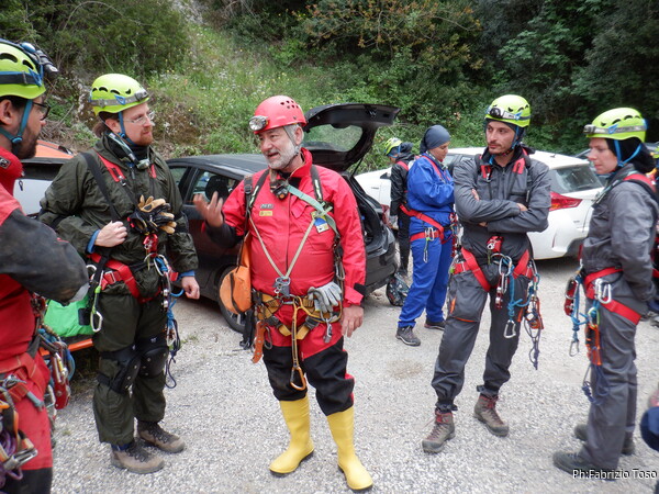 Quando iniziamo ad essere parecchi, spiego loro come trovare il parcheggio vicino alla grotta poi vado avanti per iniziare a prepararmi. Tempo un quarto d’ora e il piazzale e’ pieno di persone che si bardano per andare in grotta.