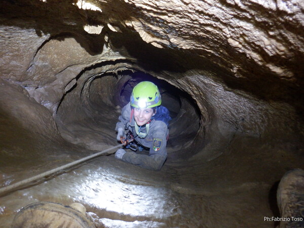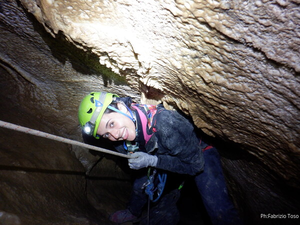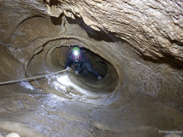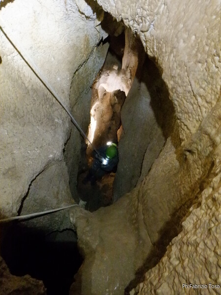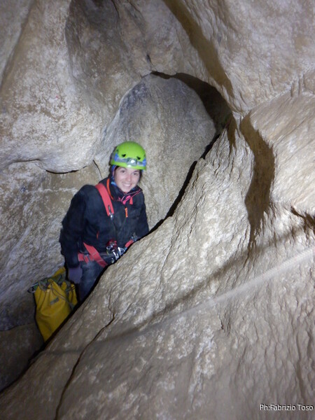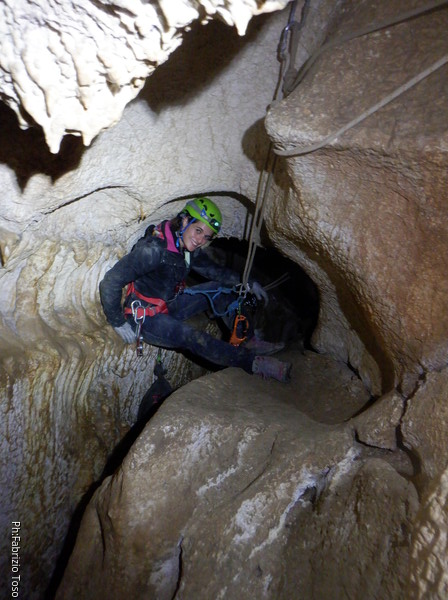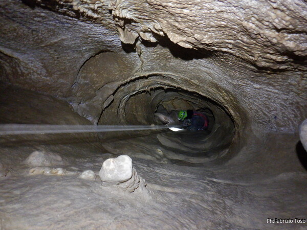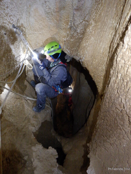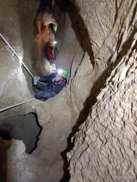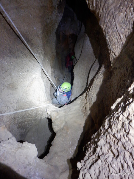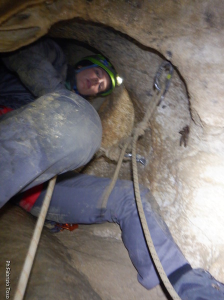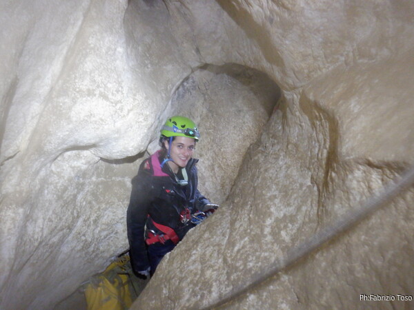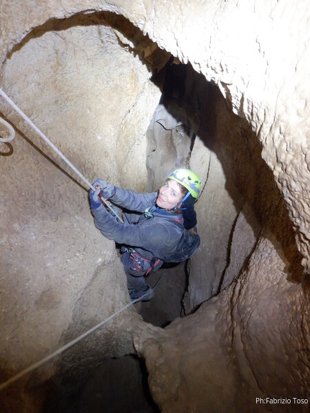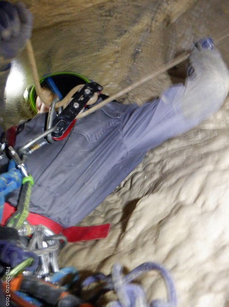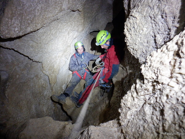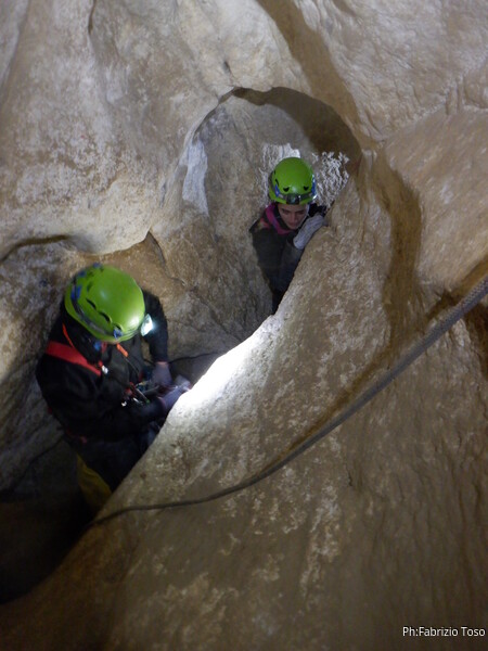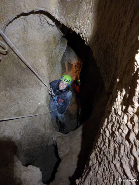 Sistemata la corda, Giulio scende e attacca deciso l’armo del traverso. Io rimango in cima al pozzetto a sorvegliare i nostri pupilli. Ecco infatti Linda che si appresta a scendere. Devono ancora affinare la tecnica, ma gia’ vanno molto tranquilli.