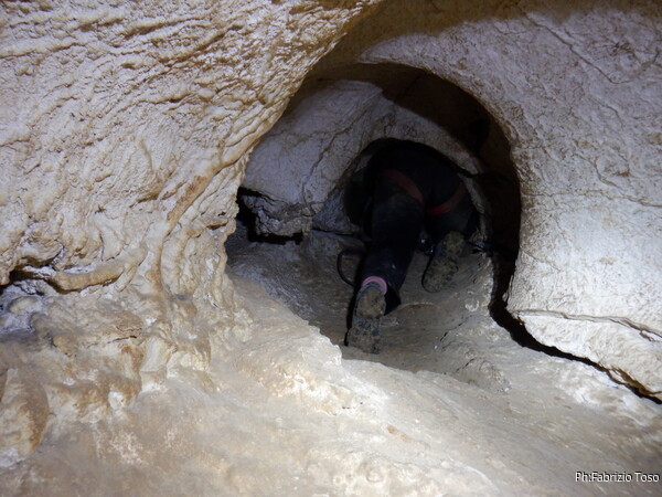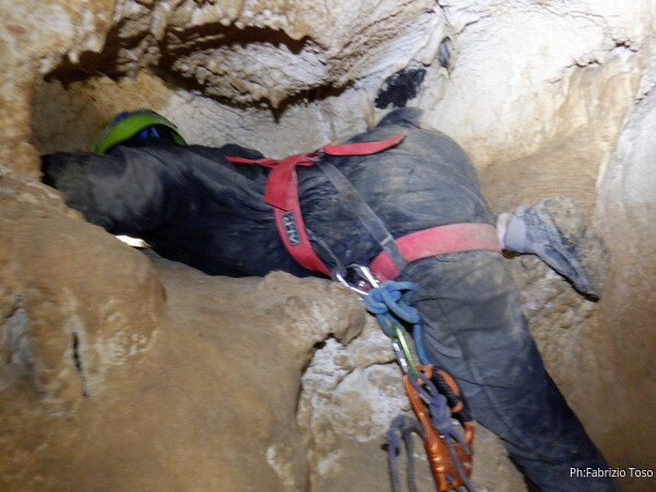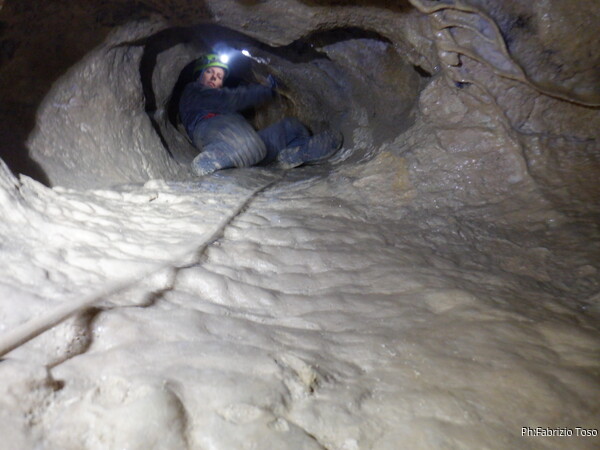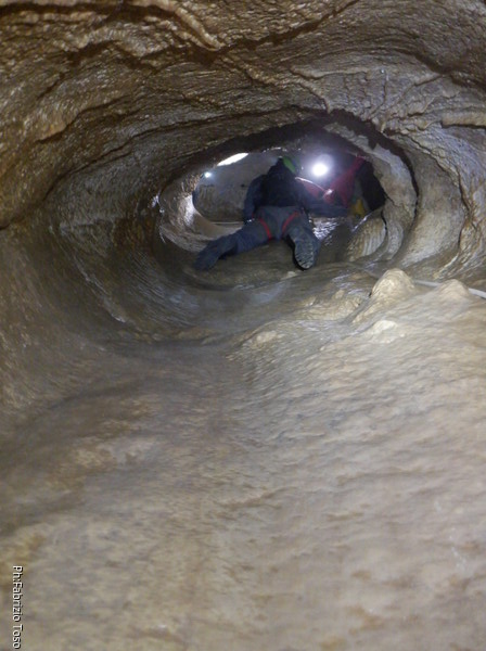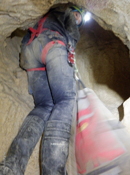 Oramai, una volta partiti formiamo un lungo serpentone di speleo ma tutto sembra proseguire senza particolari intoppi. Mano mano che gli allievi affrontano il pozzetto gli istruttori si avvicendano alla sua partenza. Succede anche a me, quindi vado avanti. Sono al traverso quando Giulio annuncia di aver terminato tutti i moschettoni. Gli dico, urlo in verita’, di pazientare e torno indietro a chiedere. Sopra al pozzetto ora c’e’ Erika, chiedo a lei i moschettoni. Una rapida consultazione verso la coda del serpentone ci permette di appurare che il resto del materiale lo ha Michele nel suo zaino che pero’ al momento e’ indietro. Mentre tramite passaparola lo zaino di Michele viene fatto avanzare, Erika rimedia un paio di moschettoni dalla propria scorta “del non si sa mai” e me li passa. Riprendo la via del traverso e strada facendo recupero ancora 2 moschettoni sostituendo quelli messi da Giulio sul traverso con un paio di nodacci. Porto il bottino a Giulio che prosegue con l’armo. Il serpentone si scuote e riprende a muoversi. Prendendo uno dei passaggi alternativi vado alla base del primo toboga, sopra di me Giulio ha terminato di sistemare il traverso, ora pero’ c’e’ un altro piccolo problema, ci manca la corda per il toboga. Con un passaparola andata e ritorno ci arriva notizia che ora lo zaino di Michele e’ disponibile. Mi offro di andarlo a prendere, rifaccio il passaggio alternativo in direzione contraria, passo il traverso e arrivo di nuovo alla base del pozzetto. Sopra c’e’ Giulietto, ha lo zaino con se, mi conferma. Me lo passa, lo prendo in consegna e velocemente lo riporto a Giulio cosi’ che possa armare il toboga. Mentre lui opera, io scendo il toboga e mi dispongo per la prima accoglienza dei nostri corsari, passo il tempo facendo l’ennesima foto al simpatico cunicolo che parte alla seconda meta’ del toboga.