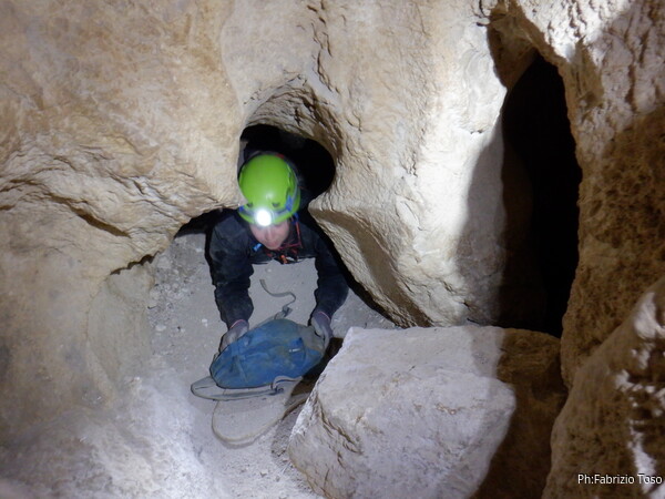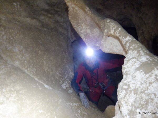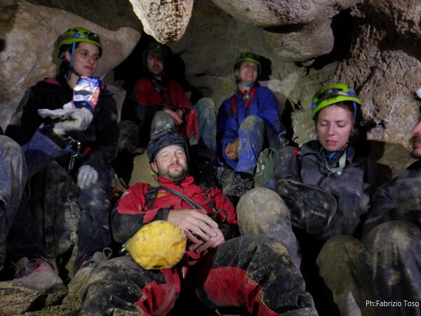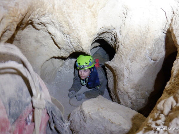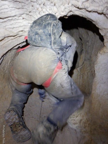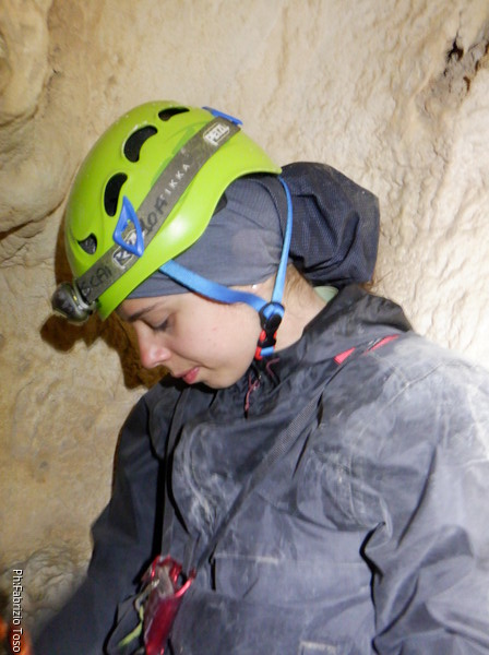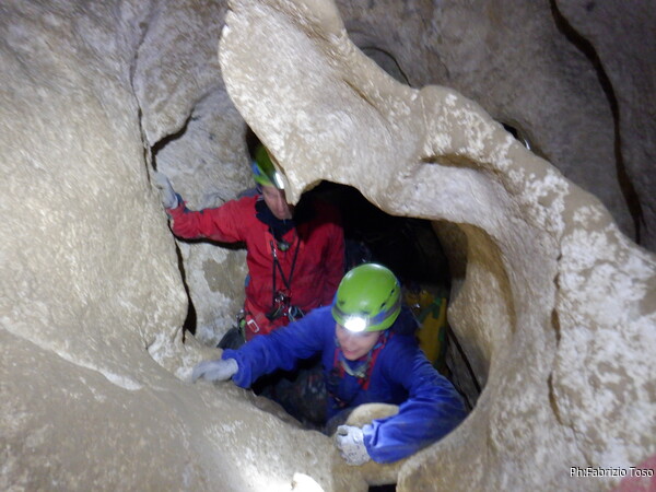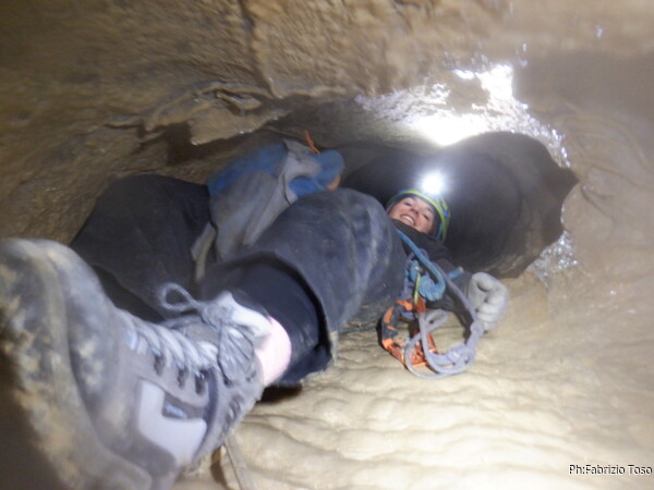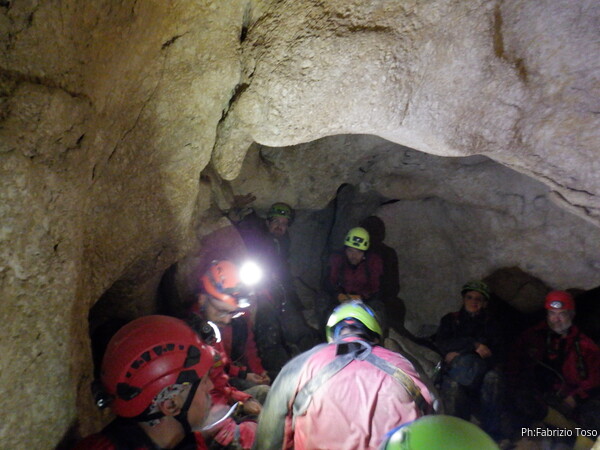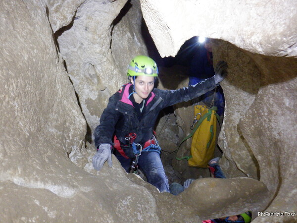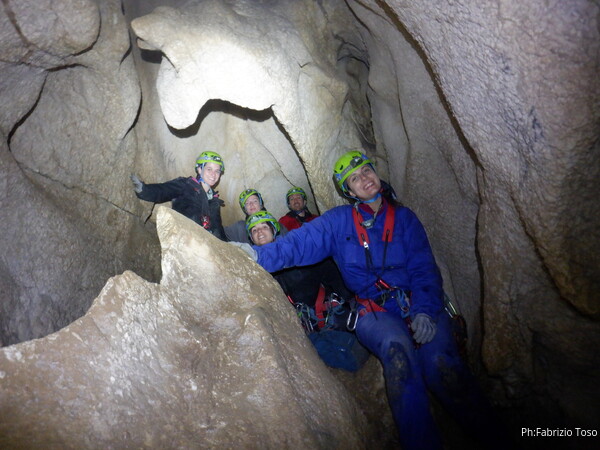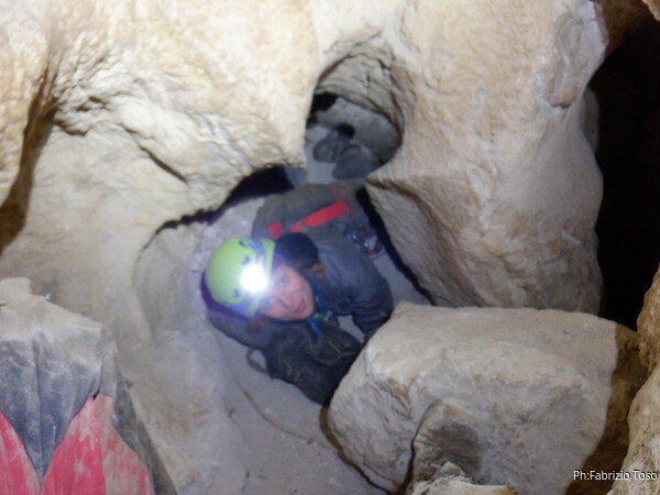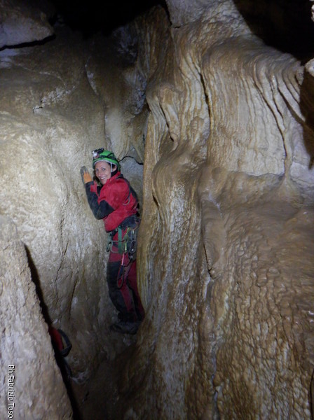 Continuano le discese, la “sala” d’attesa inizia ad essere gremita, e’ il momento che anche gli istruttori scalino in avanti per non far bloccare il serpentone. Raggiungo i ragazzi e li trovo comodamente accomodati a chiacchierare. Questo e’ forse uno dei punti piu’ intricati della grotta e mi diverto a chiedere loro quale sia la direzione da prendere. Ognuno di loro mi indica una possibile prosecuzione, ma nessuno ci azzecca. Alla fine mostro loro il passaggio giusto e li porto avanti. Il serpentone ha un poco rallentato per il passaggio del toboga. Abbiamo tutto il tempo per fare un paio di foto.
