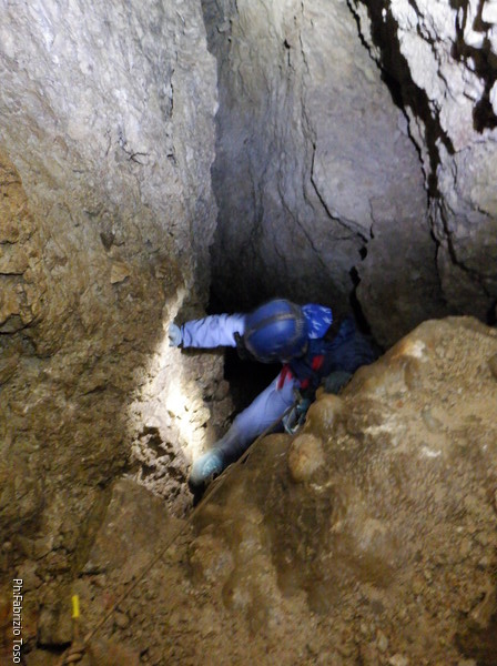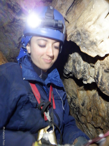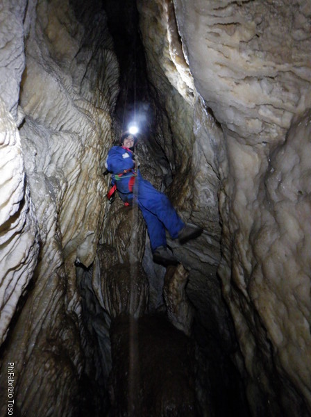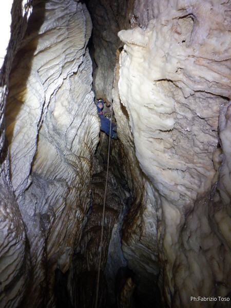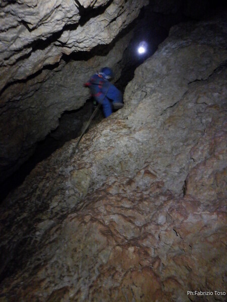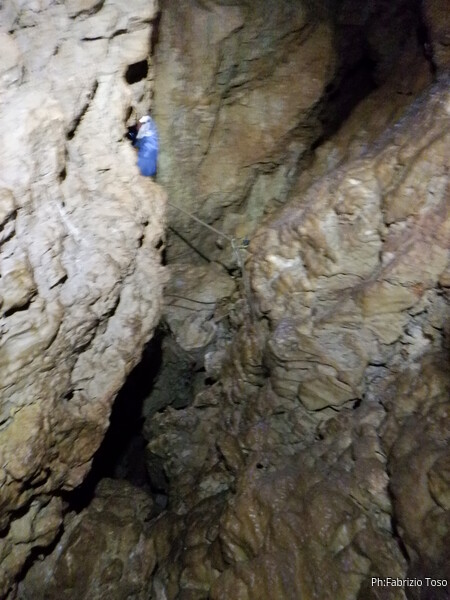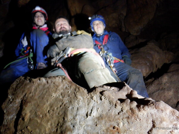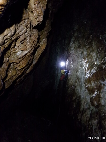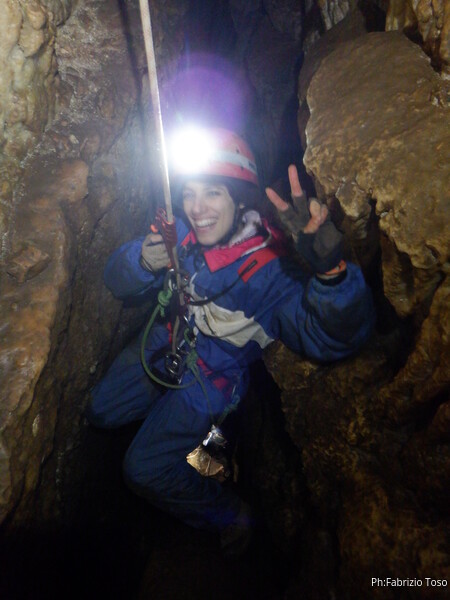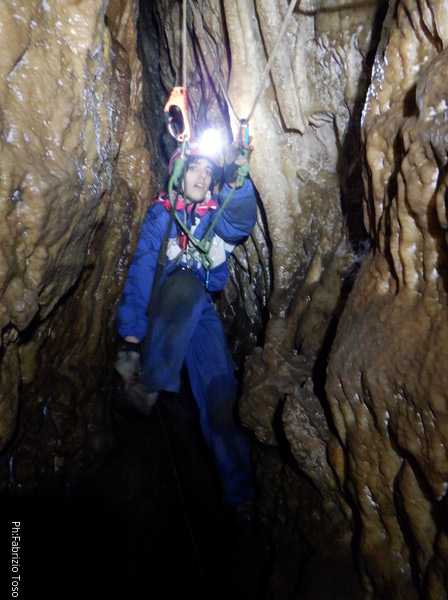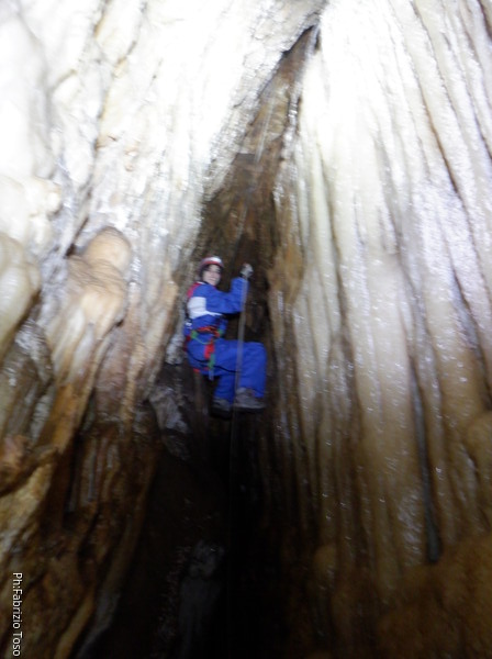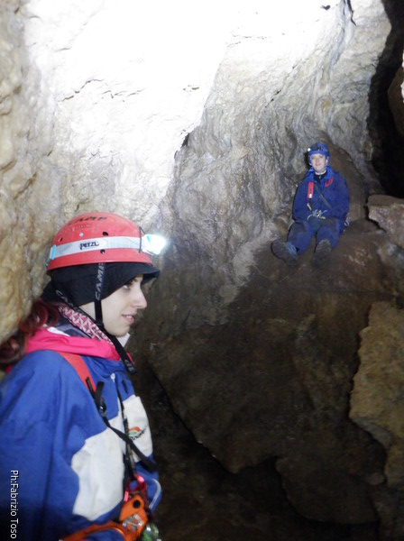 Alla biforcazione della frattura prendo a destra per armare il pozzo. Dalla volta scorsa ho imparato che proseguendo a sinistra si evita il pozzo, ma oggi e’ una uscita di corso quindi il pozzo e’ utile farlo. Mi raggiunge Elisa. Ho appena terminato di sistemare il traverso che porta al pozzo quando una faccetta sorridente si affaccia dietro Elisa. E’ Federica che e’ stata la prima dei corsisti a scendere il pozzo iniziale.
