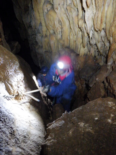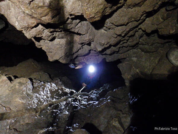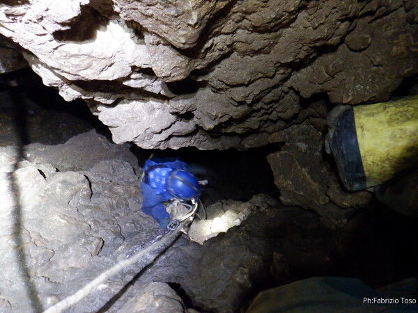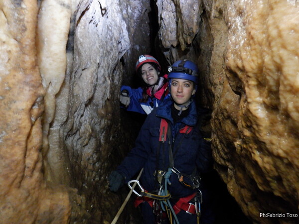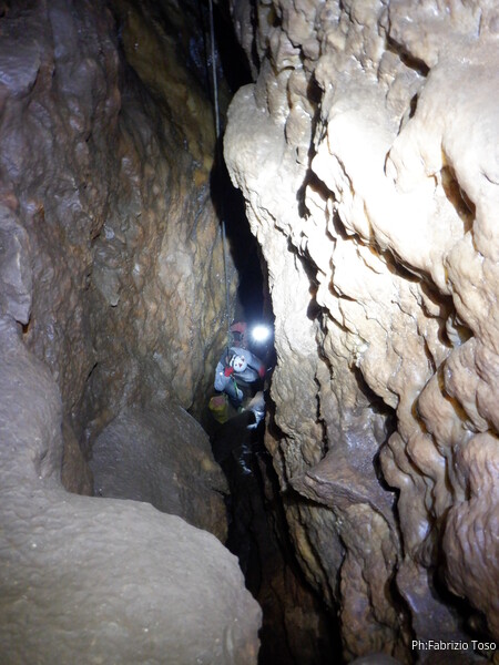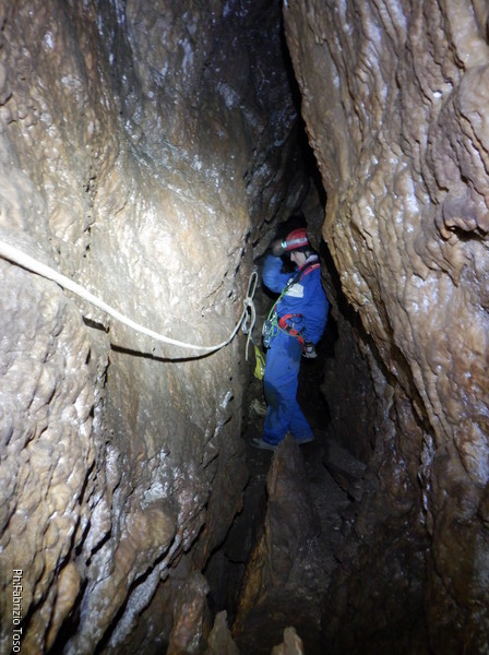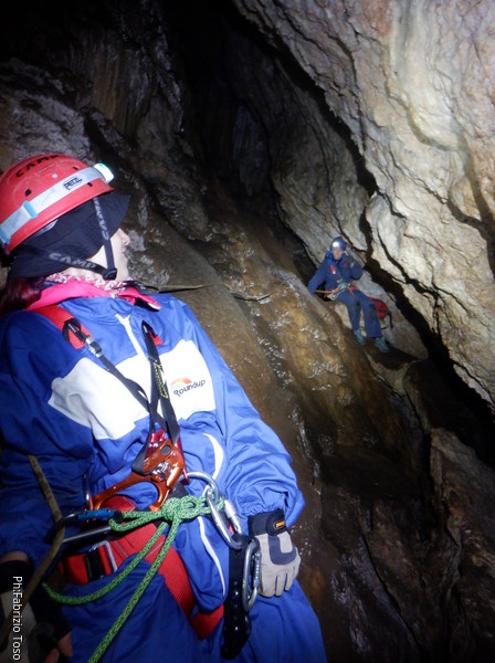 Dopo il pozzo della frattura percorriamo il meandro successivo. Della corda usata per il pozzo ce n’e’ avanzata in abbondanza quindi la utilizzo per approntare una sorta di traverso per dare sicurezza a chi passa, ci sono un paio di passaggi esposti che di solito mettono timore i novelli speleo. Sono davanti al pozzo successivo, ne approfitto per fare una foto al meandro appena passato, con le mie compagne d’armo in bella vista.