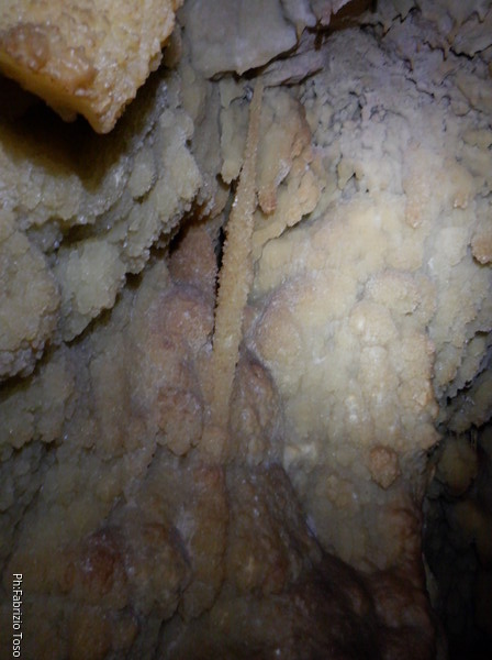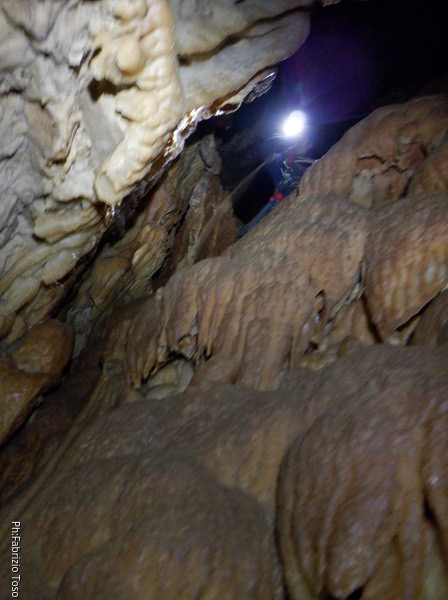 Proseguiamo per il meandro. Chiacchiero a ruota libera descrivendo la grotta e le particolarita’ che mi vengono in mente. Elisa probabilmente quel che dico lo ha gia’ ascoltato la volta scorsa, ma oggi le spiegazioni sono per Federica. Continuo ad imperversare con la fotocamera, ma al solo scopo documentativo!