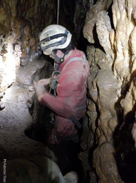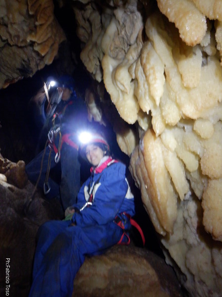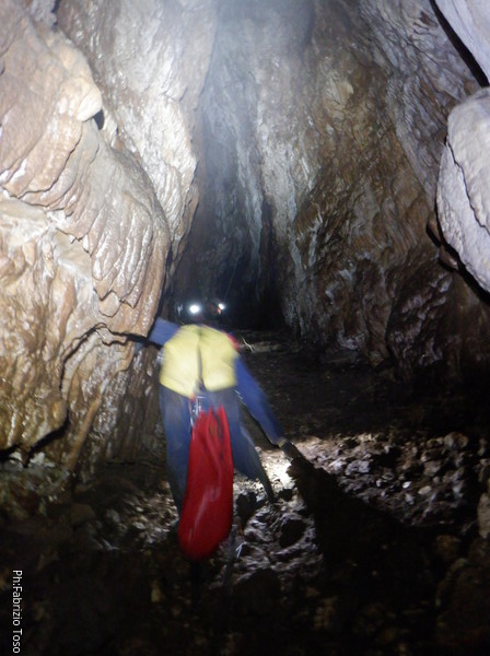 Federica va avanti seguendo Gabriele e si riunisce al gruppo dei corsari alla base del pozzo della frattura, il secondo da salire uscendo. Visto che oramai conosco la strada per evitare il pozzo faccio da guida a Elisa fino al meandro principale. Prima che prosegua verso l’uscita mi faccio restituire la chiave.