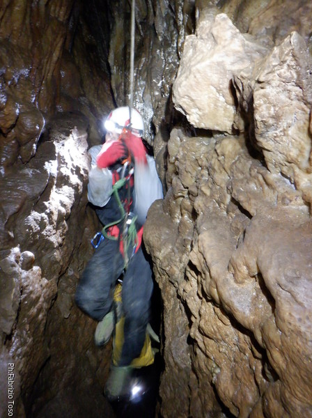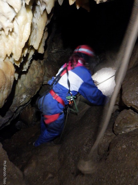Torno indietro, sgancio la corda del traverso, chiedo a Gabriele di recuperarla e poi riprendo la scorciatoia andando a fare assistenza a chi risale il pozzo. Ecco Federica che arriva, forse inizia ad accusare un poco di stanchezza, ma non lo da’ troppo a vedere.