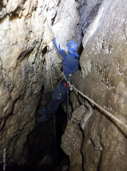 Ora mancano pochi metri di cammino per arrivare alla risalita “grande”, quella che porta alla frattura gemella, parallela a quella che abbiamo percorso finora. Anche questa ha un armo fisso. Dall’ultima visita so che l’armo e’ in buono stato quindi non dobbiamo mettere una nostra corda…meglio, perche’ non l’abbiamo! Ad ogni modo risalgo per primo controllando che sia tutto a posto. Mi fermo subito dopo il frazionamento per far salire Federica e farle assistenza.