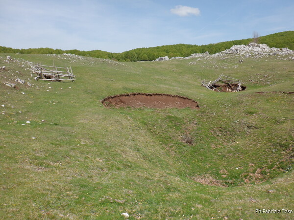 Strada facendo incontriamo le doline recintate, o quasi. Le controllo ma ancora non lasciano intravedere possibili approfondimenti.