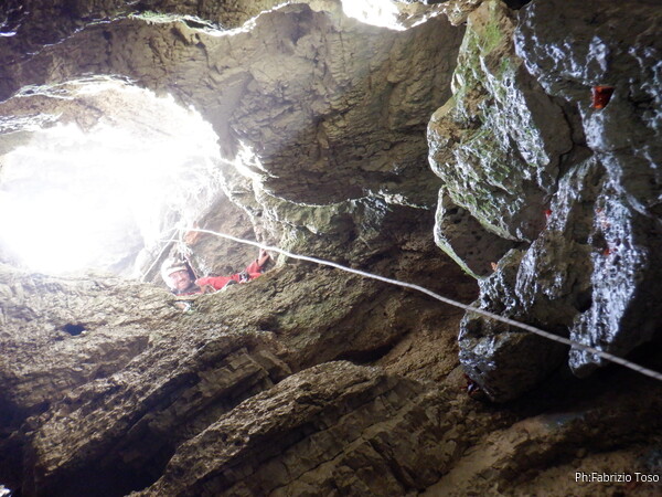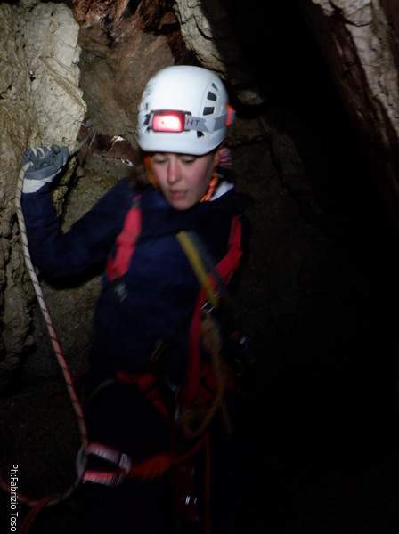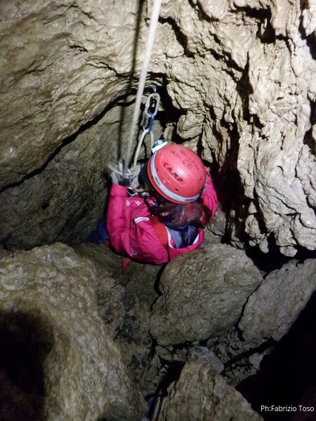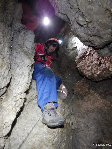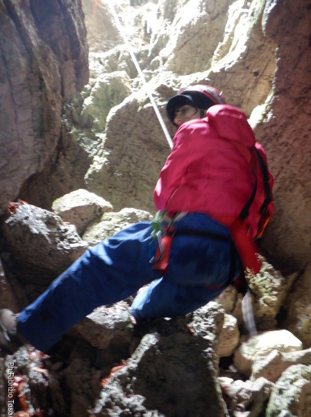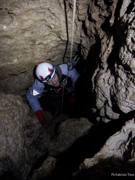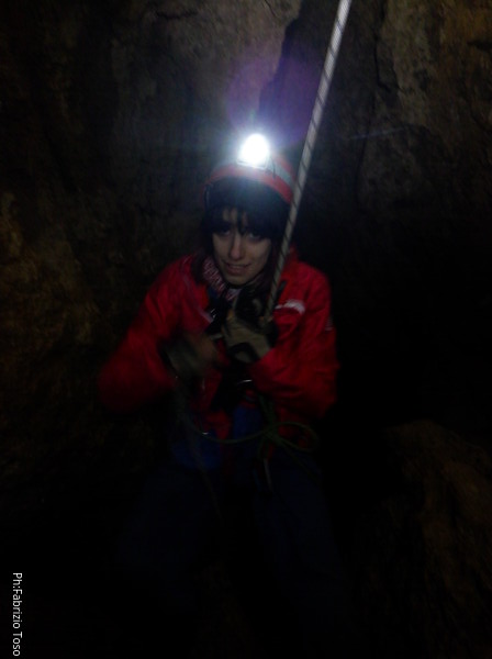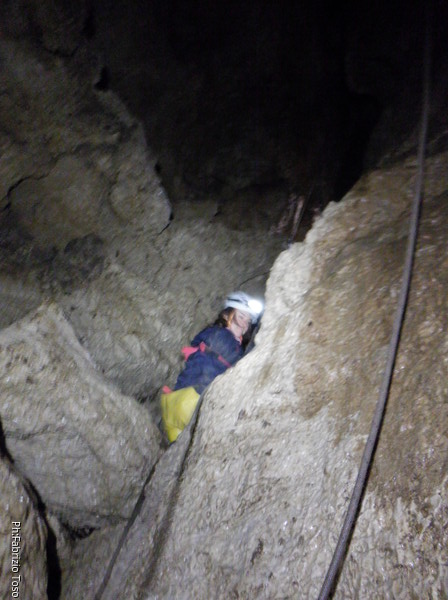 Lascio a Irene il compito di assistere chi arriva, devo andare a capire come prosegue la grotta e cosa si deve fare per l’armo. A sinistra c’e’ un dislivello di 1 metro e subito sotto un “pianerottolo” dove, alla mia destra, inizia un pozzo. Organizzo mentalmente il da farsi e torno su dai miei amici per fare la cernita del materiale necessario. Ok, abbiamo tutto, torno giu’ sistemando il terminale della corda del pozzo precedente come guida verso il successivo. Sistemo la corda con il classico e sicuro attacco doppio, la devio corto corto su un attacco subito sotto e la lascio andare giu’. Anche questo mi sembra un pozzo da circa 8m. Oramai nella saletta sopra di me inizia ad esserci ressa, iniziamo a scendere. Per primo scende Gabriele col materiale necessario ad armare i pozzi successivi e per fare sicura agli allievi. Il primo a cimentarsi e’ Victor che naturalmente costringo ad una scomoda sosta per una foto.