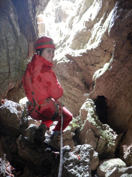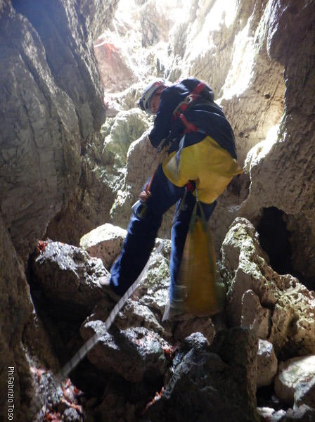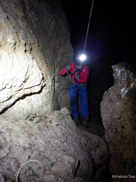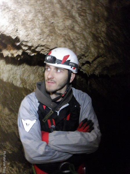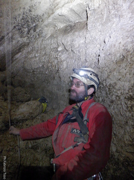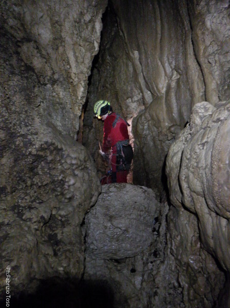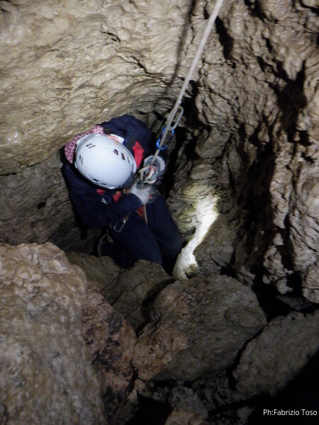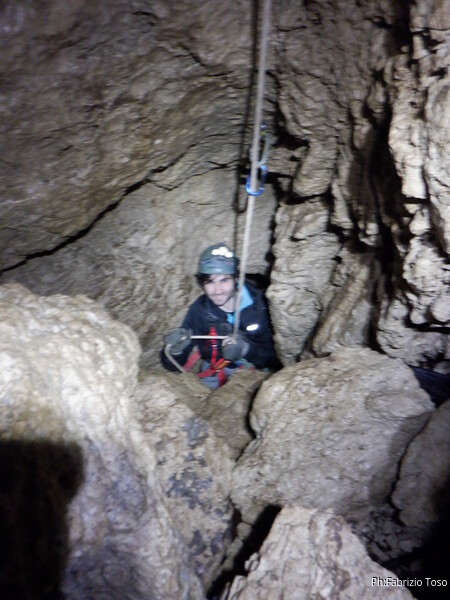 Andro’ avanti ad armare, anche se ricordo nulla della grotta in qualche maniera faro’. Scendo, sistemo il frazionamento successivo su singolo fix doppiandolo su naturale con un cordino. Tutto pronto, sono alla base del pozzo, dall’esterno saranno in tutto 8m. Gabriele scende al frazionamento a fare assistenza ai corsari che scenderanno per essere poi amorevolmente accolti da me.