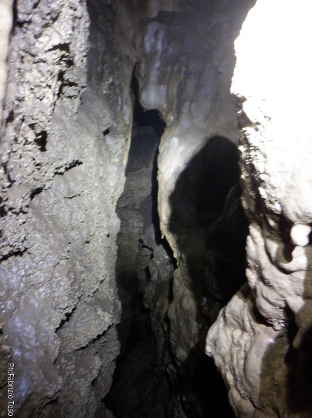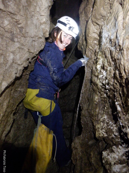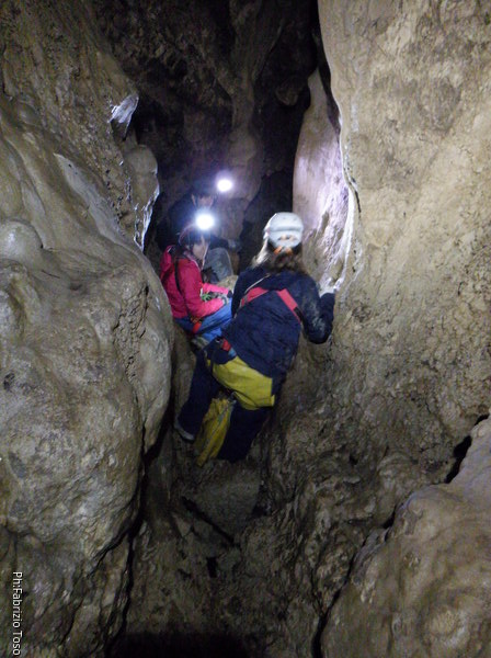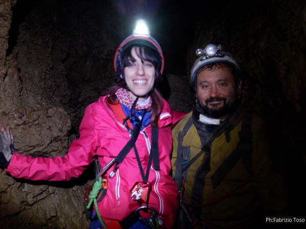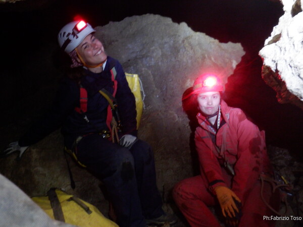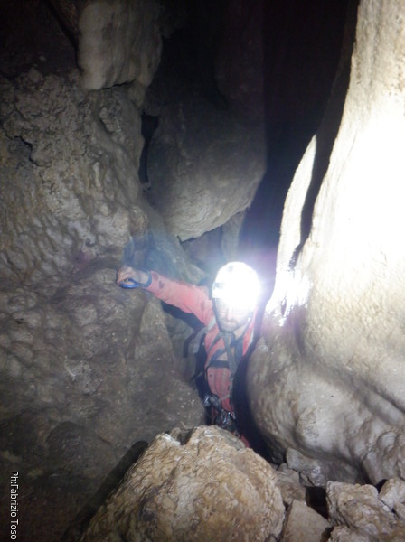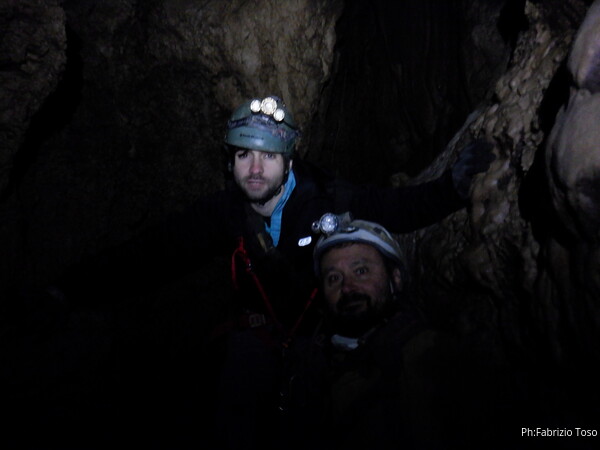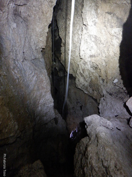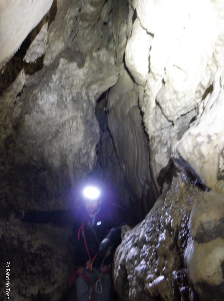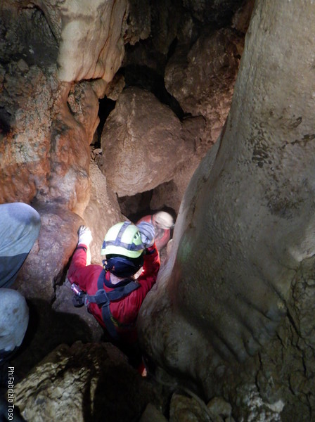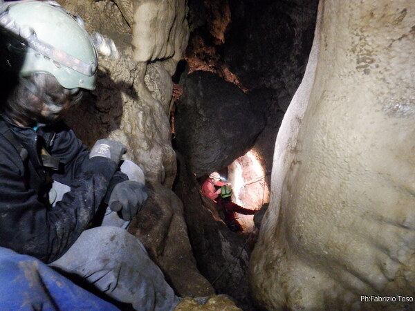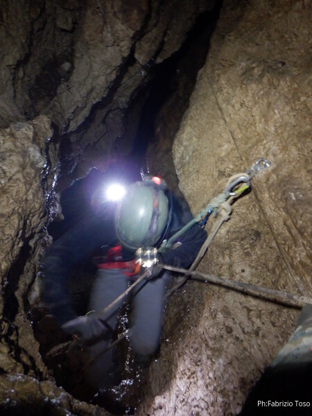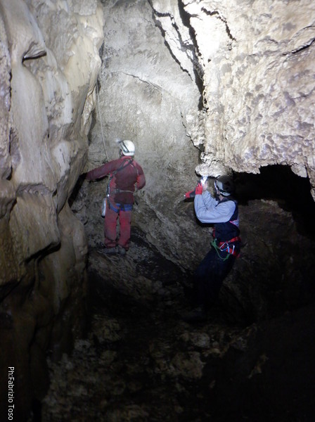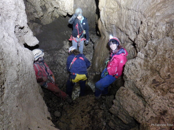 Siamo alla base del pozzetto, l’ultimo che scenderemo per oggi. La grotta non termina qua, anzi, sembra diramarsi. In fondo all’ambiente dove siamo c’e’ una piccola risalita di un metro che porta ad uno stretto pertugio che dovrebbe proseguire con un pozzo. Sulla destra della risalita inizia un altro pozzo di una decina di metri che porta…chissa’ dove!