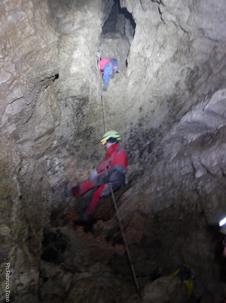 Dopo tocca a me scendere. Sceso il pozzo arrivo in un ambiente comodo dove poter sostare. Vedo le corde sistemate, Gabriele e’ sotto che sistema per l’armo successivo.