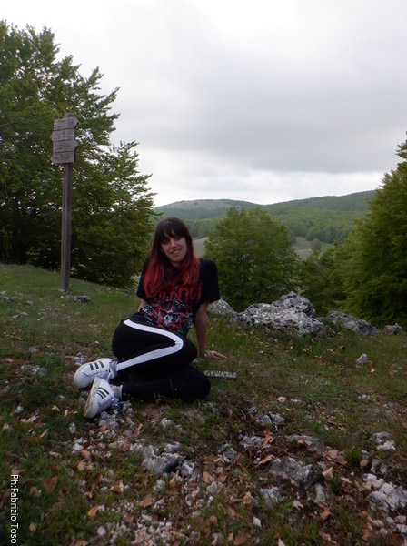 Parto pure io seguito dal resto del gruppo. Non poteva mancare una foto della bella Aurora che sorride soddisfatta dell’inizio giornata. Faccio sempre questa discesa con particolare piacere, e’ stato il primo tratto di prato su cui sia riuscito di nuovo a camminare autonomamente senza l’aiuto di stampelle o bastoncini dopo la mia sciagurata esperienza col covid.