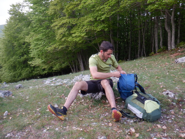 Dopo un breve quanto frugale spuntino e un sorso d’acqua riprendiamo la salita. Sembra che disarmare tocchi a me. Va bene, mi attrezzo all’attesa paziente mentre vedo il gruppo risalire. Mi fara’ compagnia Luca scelto come “volontario portatore di zaino”, compito che come potro’ notare, assolve alla perfezione!