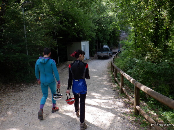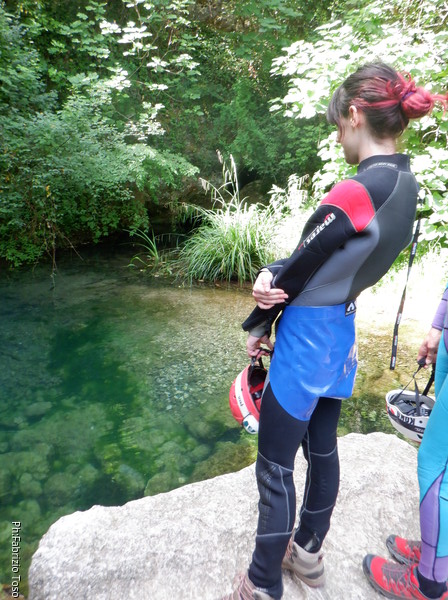 Conosciamo lì un amico di Bibbo, uno dei gestori della grotta che ringrazio per avermi prestato la muta di suo figlio. Con molta fatica, dunque, indosso la mia prima muta. Fa un caldo pazzesco, si inizia subito a sudare dopo cinque secondi; tuttavia, l’aspettativa e l’emozione superano di gran lunga la sofferenza del caldo.
