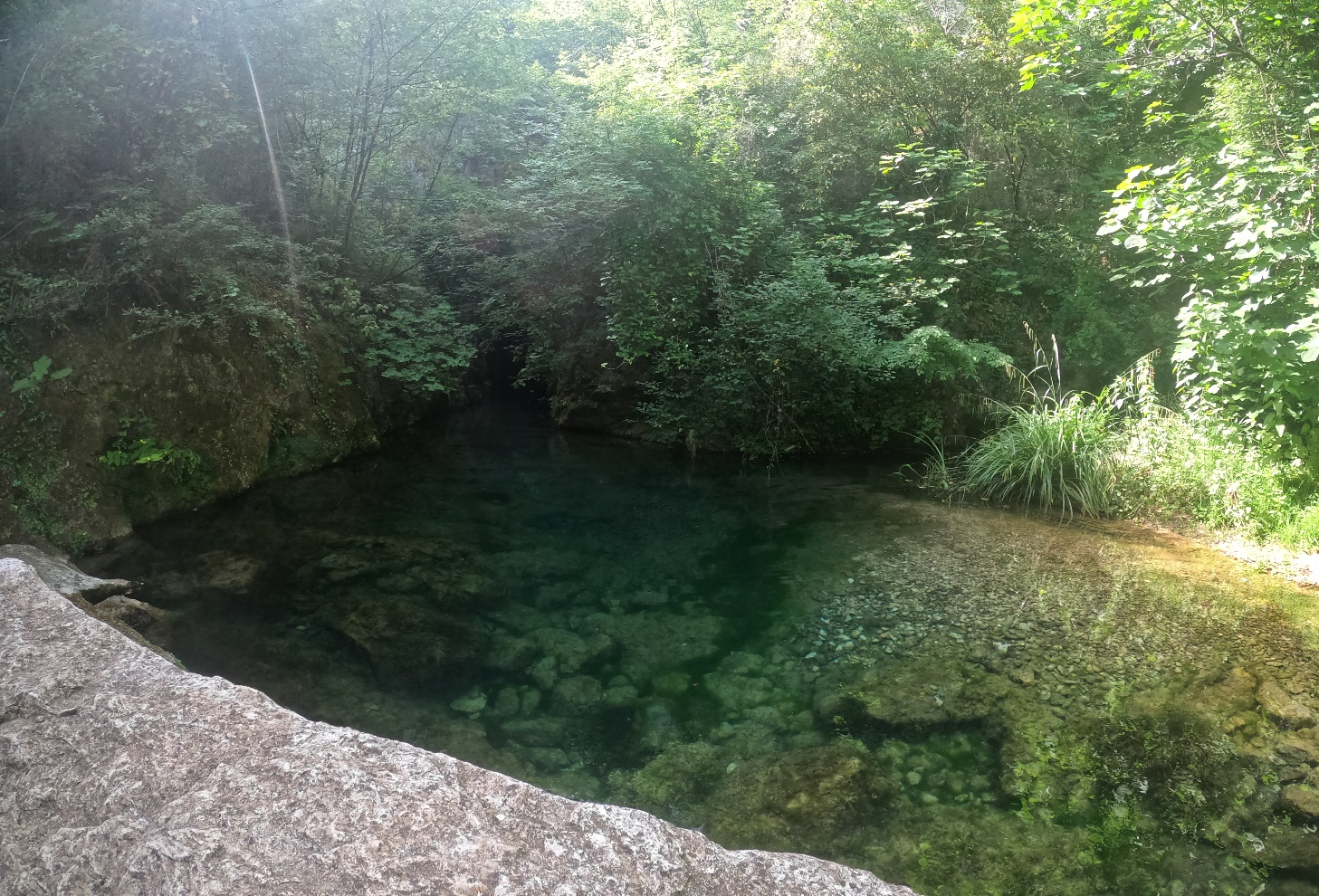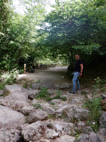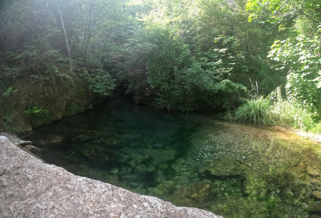 Dopo la foto ci incamminiamo in una discesa che ci porta alla grotta, prima però una sosta al laghetto delle trote, se non ricordo male.