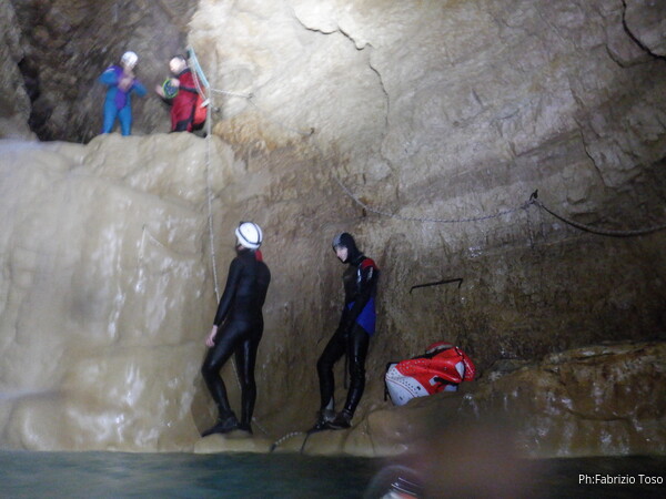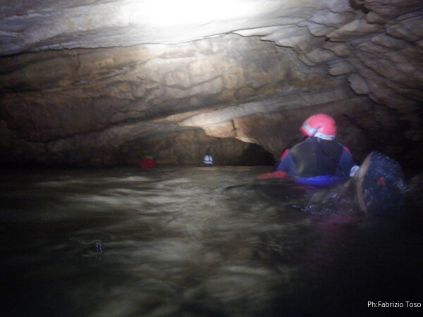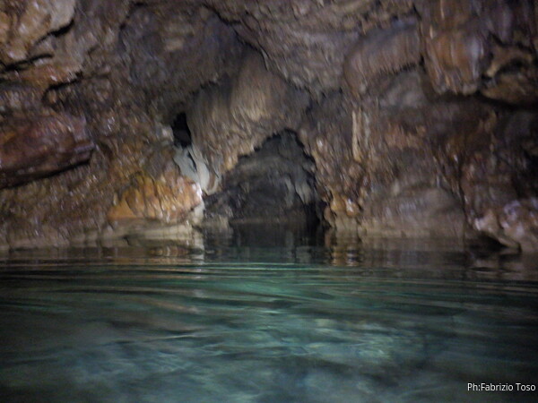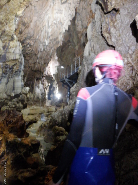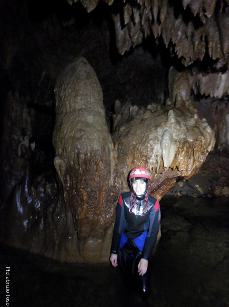 In grotta Giuseppe si offre come cicerone per una rapidissima visita alla parte turistica. Mentre loro vanno io ne approfitto per terminare la vestizione. Quando siamo di nuovo tutti assieme, scendiamo a livello dell’acqua e iniziamo la nostra avventura! Tanto per la cronaca sono le 10.30 circa.