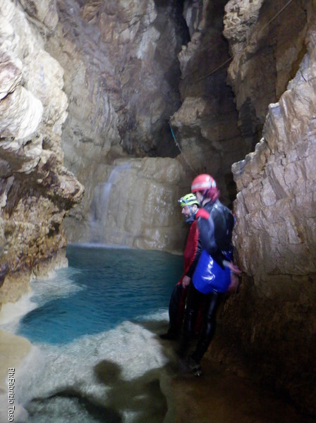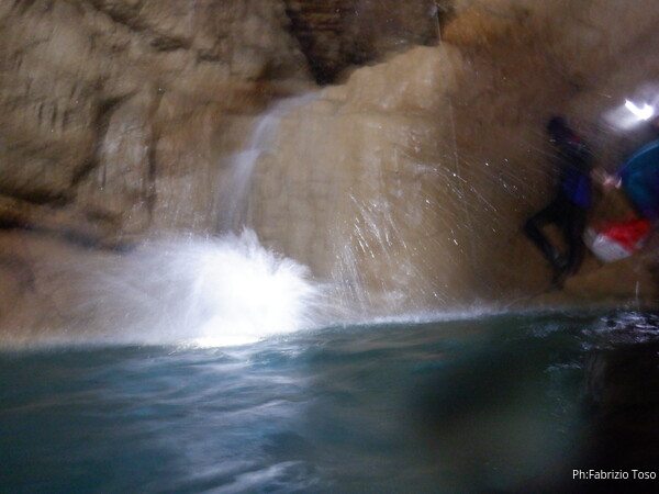 Eccola, forse perche’ e’ il primo punto interessante che si incontra, ma vederlo e’ sempre una emozione positiva. Dimenticavo di dire, Giulio e’ un vecchio lupo ipogeo e conosce questa grotta, ma il resto del nostro formidabile gruppetto e’ composto da entusiasti ex-corsisti, quindi mi sento in dovere di fare le presentazioni di quel che vedono per la prima volta. Ci fermiamo ad ammirare la cascata mentre la presento ai miei amici.