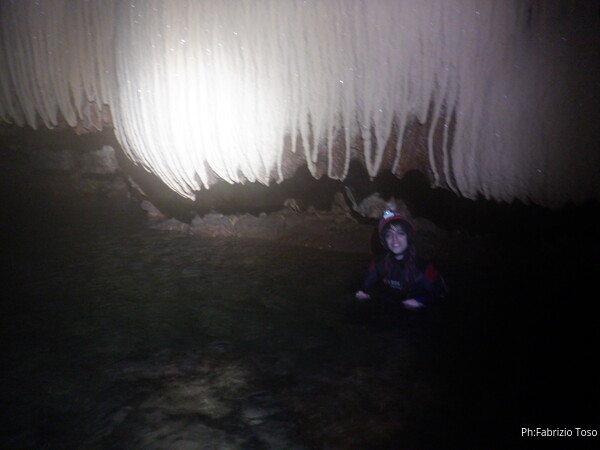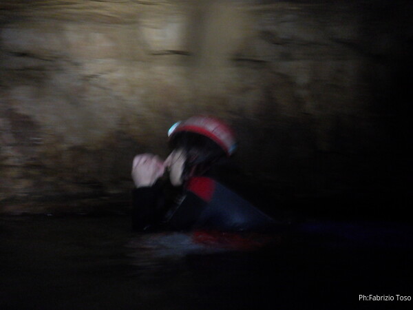 Dopo il lago arriviamo al sifone. Dal lato di Pastena e’ il solito coacervo di “monnezza” varia. Avrei voluto farne foto, me ne dimentico mentre tranquillizzo il gruppo, titubante circa l’opportunita’ di affrontare il pattume. Spiego loro che nonostante l’aspetto decisamente poco invitante, e’ tutta roba che galleggia e sotto l’acqua e’ quasi pulita. Mostro loro come dovranno nuotare per spostare la zozzeria che si presenta loro davanti, poi, per avvalorare quel che dico, mi tuffo nel pattume e lo scosto mostrando che l’acqua sotto sembra trasparente. Il sifone e’ comodamente aperto, ha una luce di almeno 50 cm. Aspetto di vedere che inizino a seguirmi, poi parto fendendo la monnezza con decisione e robuste manate. Quando l’ambiente torna ad essere bello torno a fare foto e costringo Federica a farmi da modella.