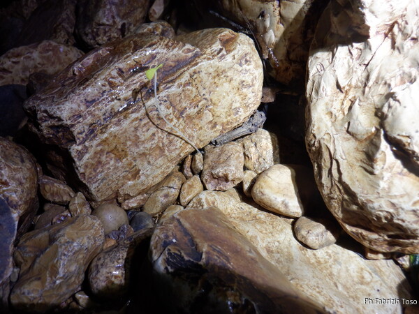 C’e’ Luca che tra le altre cose studia piante e animaletti vari cosi’ ogni volta che incontro un qualcosa mi fermo per farglielo osservare. Trovo un niphargus, un simpatico quanto minuscolo gamberetto. Provo a prenderlo nel palmo della mano ma e’ piu’ rapido di me. Mi rifaccio su un “coso” piu’ grande, eccolo.