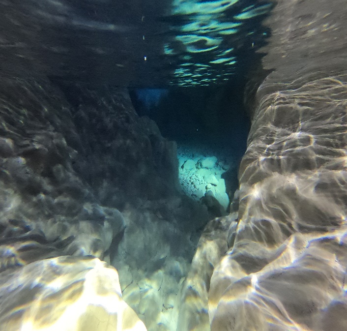 Scendiamo da un corda al di sotto del ponte di passaggio turistico e ci troviamo davanti l’acqua bellissima e cristallina con la quale ho il primo impatto: devo dire che per un breve momento mi spezza il fiato, ma l’entusiasmo e la meraviglia mi fanno passare subito la sensazione di gelo, inoltre ho avuto modo di scoprire in quel momento il funzionamento della mia muta e come l’acqua una volta in piedi si riscaldasse molto velocemente lasciando una sensazione piacevole addosso.