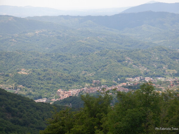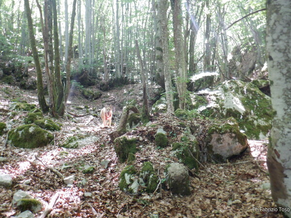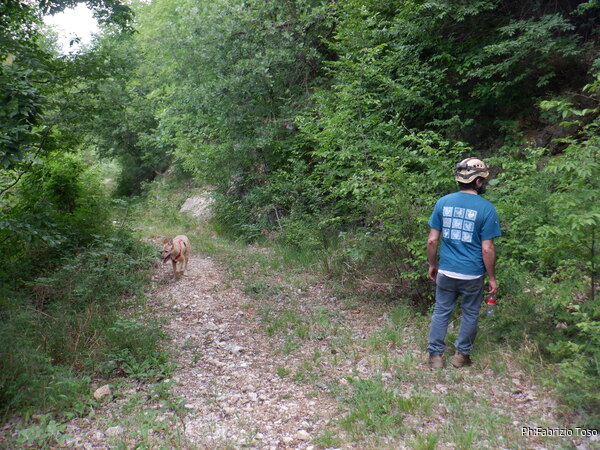 Siamo ancora in mezzo alla boscaglia quando Gabriele e il suo fido GPS dicono che siamo vicini ad una grotta catastata, quella di Morra Puina. Vale la pena cercarla per riprendere il punto preciso. Giriamo per un bel pezzo intorno al punto segnato, ci allontaniamo in tutte le direzioni per almeno 100m ma della grotta nulla. Alla fine ci dichiariamo sconfitti. Sotto di noi sento il rumore di macchina, la strada e’ vicina. Mi sento un poco stanco, propongo una sosta. Sia Gabriele che Luna sembrano d’accordo. Luna e’ particolarmente soddisfatta quando vede che le ho portato una mezza porzione di carne. Se la mangia in un soffio mentre io sgranocchio frutta secca (rigorosamente scaduta!). Rinfrancati riprendiamo il cammino. Scendiamo verso la strada. Incontriamo prima una sterrata, Gabriele dichiara che e’ la strada che segue il tracciato dell’acquedotto che potrebbe portare l’acqua a Livata se un giorno decidessero di metterlo in funzione.
