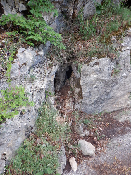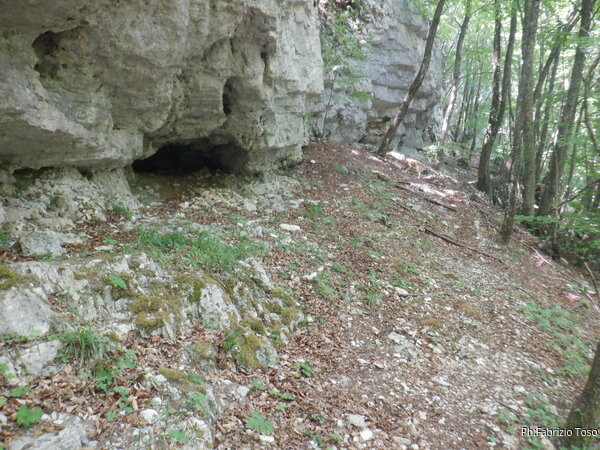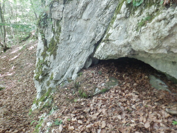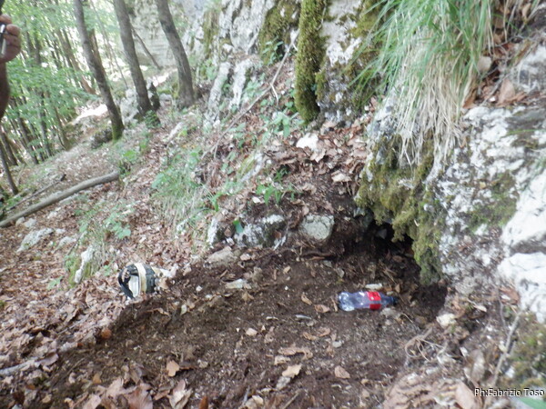 Dopo aver visionato una quantita’ di buchi piu’ o meno interessanti, ma nessuno con aria e tantomeno catastabile, decidiamo di lasciare il fondovalle e salire alla nostra destra (per chi ama le definizioni, la sinistra orografica del nostro torrentello in secca). Incontriamo presto una parete che ci ostacola la salita. Iniziamo a costeggiare la parete.
