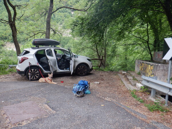 Girata l’ultima curva eccoci in vista del tornante dove abbiamo lasciato la macchina. Poggio lo zaino, sistemo Luna e prendo dell’acqua fresca dalla fontana per farla bere. Quando lei e’ sistemata, mi cambio e risistemo le mie robe nello zaino.