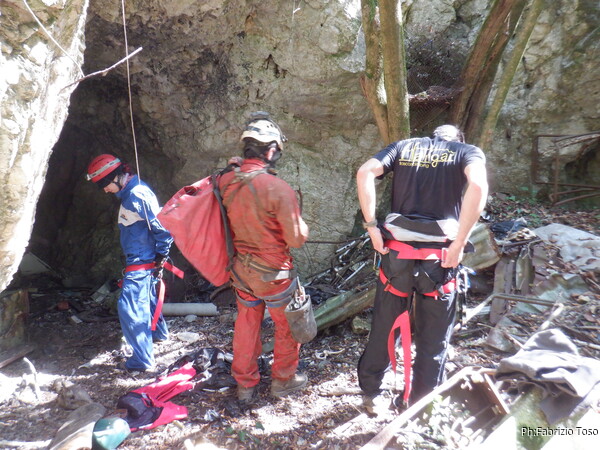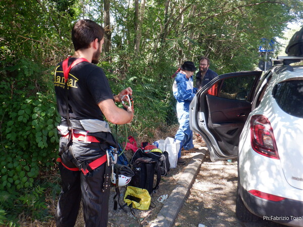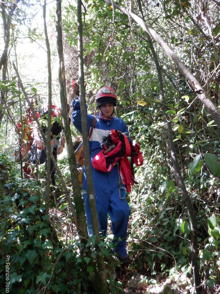Qualche minuto e ci raggiunge anche Gabriele. Intanto Federica e Luca, guardandosi a vicenda affrontano il breve meandro fino al pozzetto d’uscita. Pochi minuti ancora e lo risaliamo tutti. Anzi, mentre lo risalgo io, i nostri giovani esploratori partono per vedere anche la parte finale della galleria artificiale. Tornano indietro mentre Gabriele fa capolino dal pozzo. Il tempo di togliere la corda e siamo fuori.