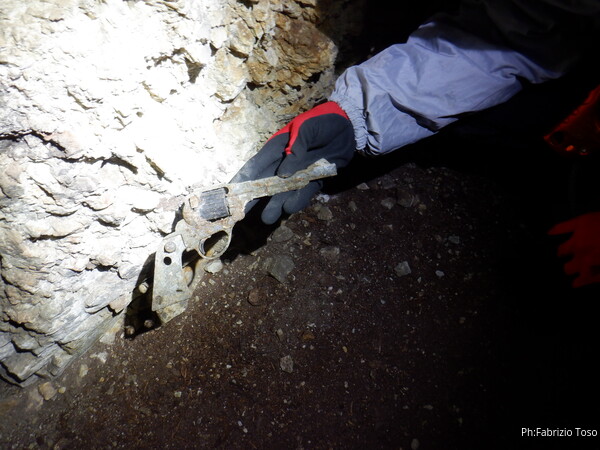 Oggi Gabriele sembra di malumore, o almeno non e’ socievole come al solito. Infatti mentre noi finiamo di vestirci lui si carica lo zaino in spalla e senza tante cerimonie si avvia nella galleria. Noi 3 terminiamo di sistemarci quindi lo seguiamo. Strada facendo mi improvviso cicerone per i miei ex-allievi visto che sono alla prima visita in questa simpatica grotta. Troviamo una pistola, a prima vista sembra vera ma prendendola su ci accorgiamo che e’ di plastica. Una foto la merita comunque.