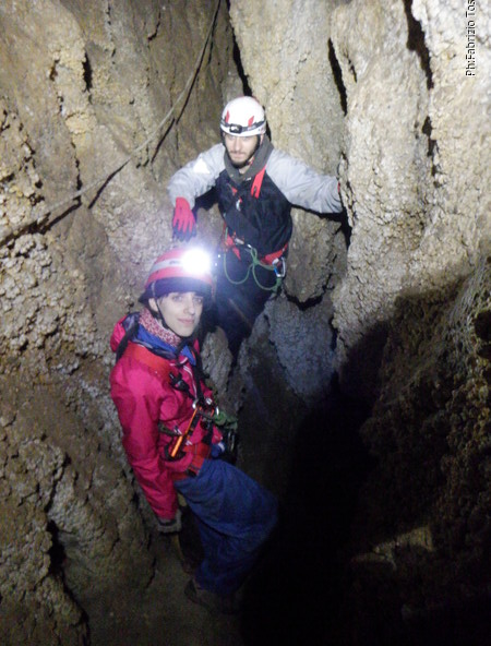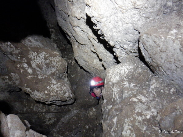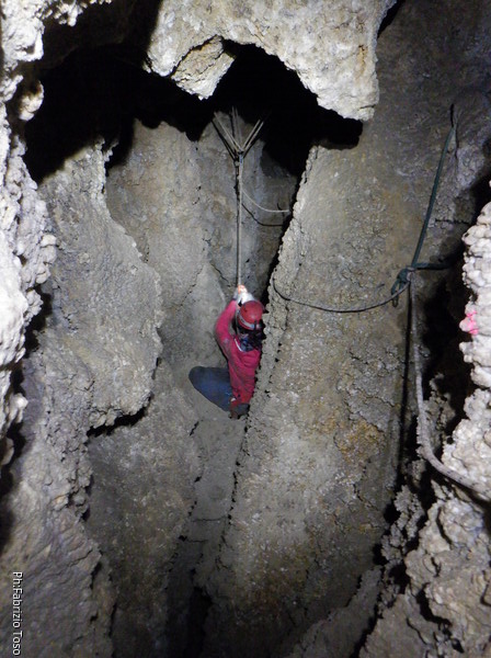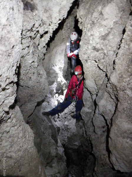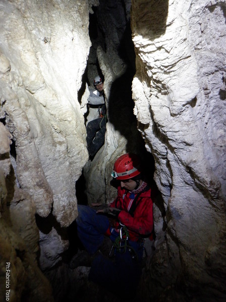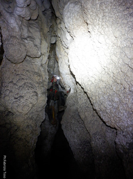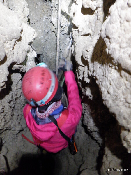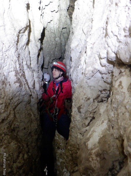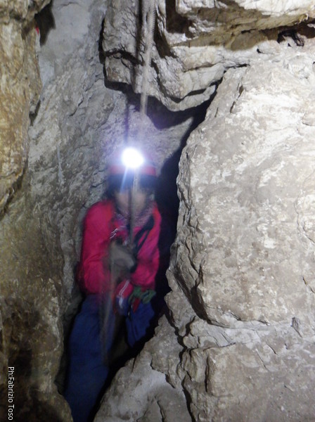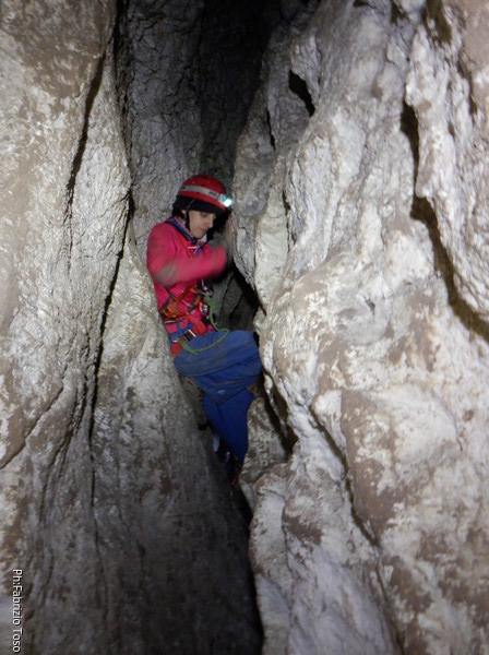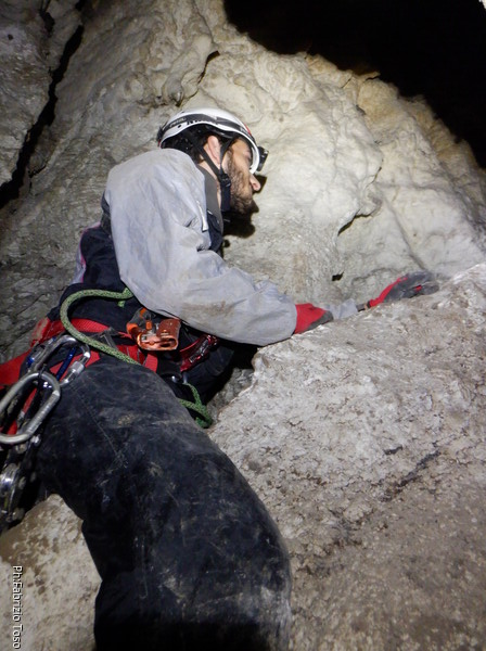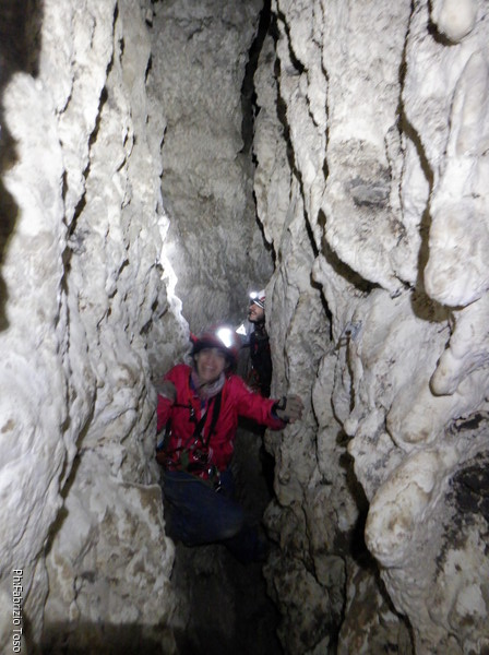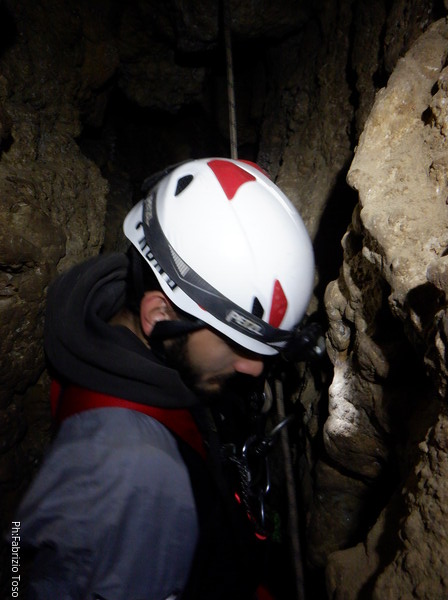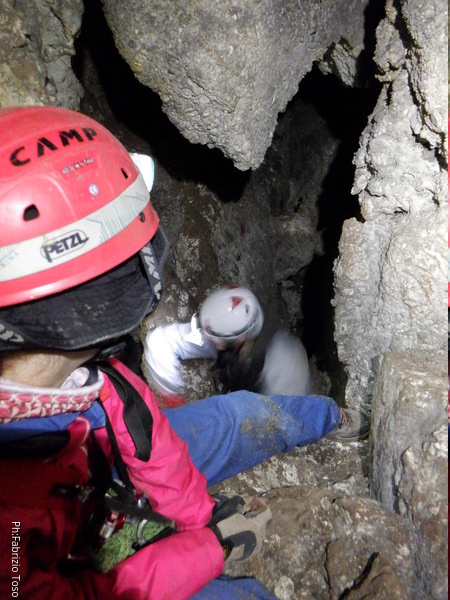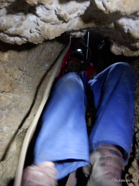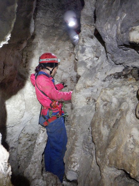 Li aspettiamo dando loro un urlo perche’ ci raggiungano senza prendere strade strane. Siamo di nuovo tutti assieme. Gabriele affronta per primo il giu’-su, seguito da Luca, Federica e me. Mi attardo un poco per il meandro di ritorno. Quando arrivo alla base del pozzo da salire trovo che Luca e’ gia’ partito.