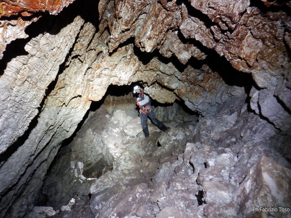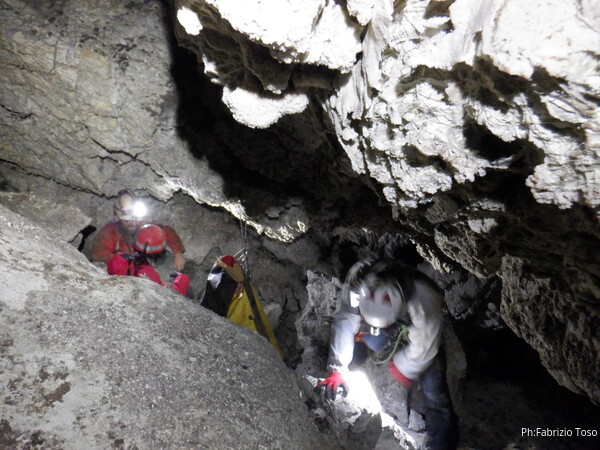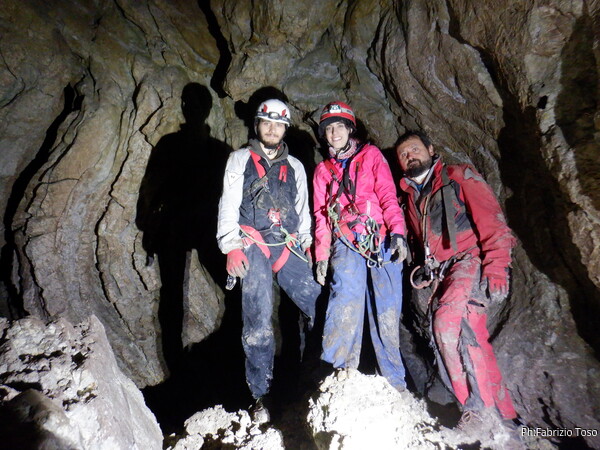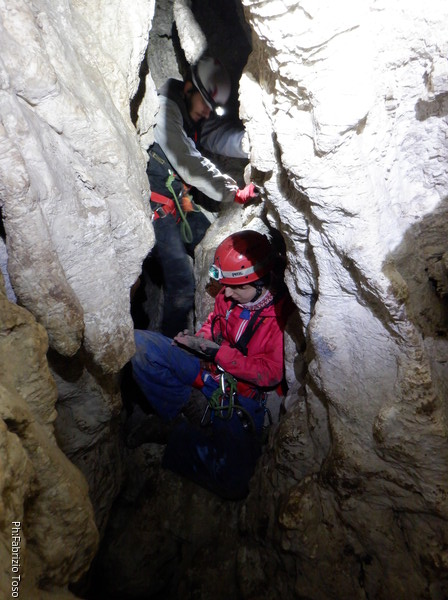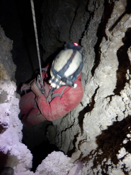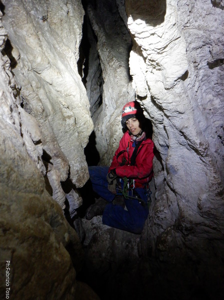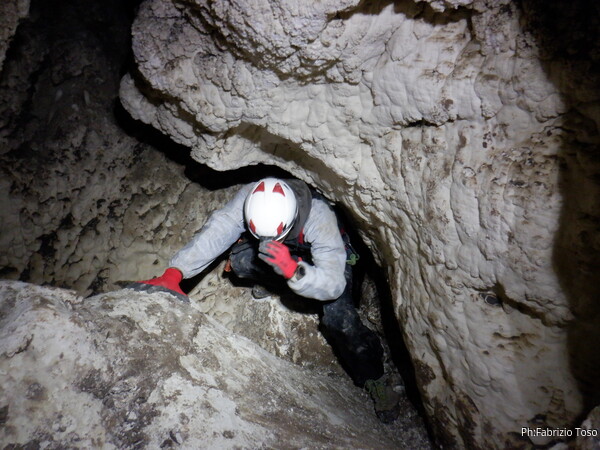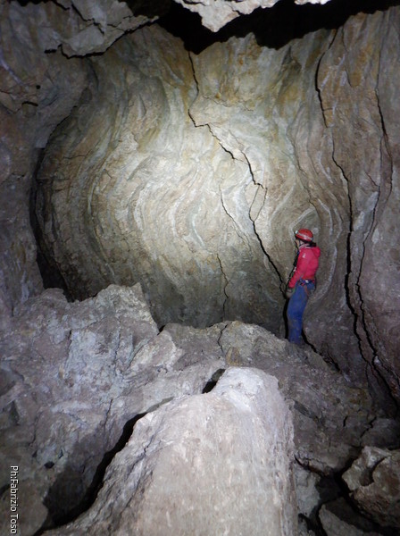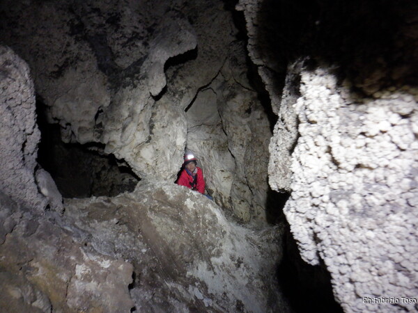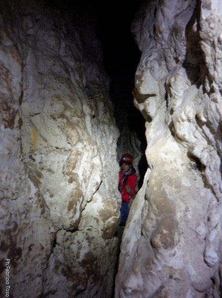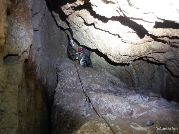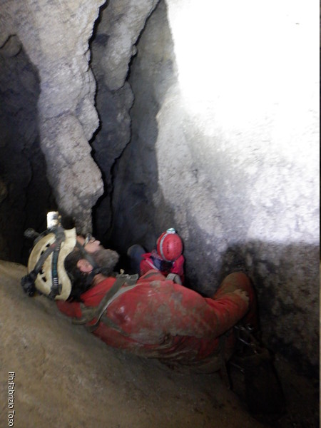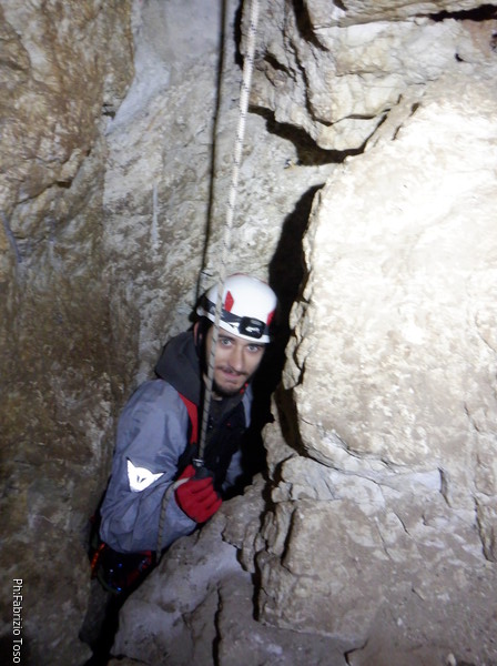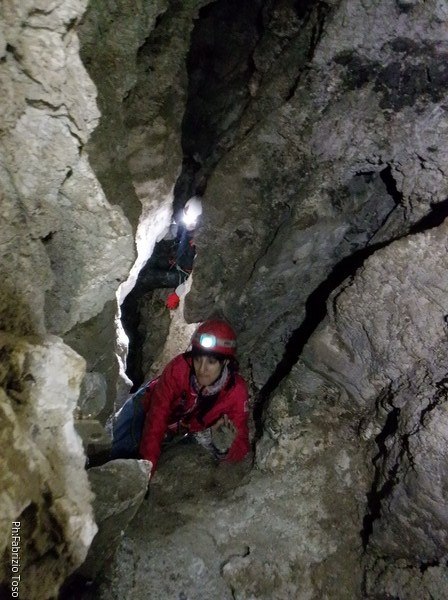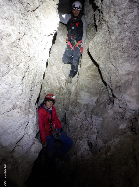 Li aspettiamo dando loro un urlo perche’ ci raggiungano senza prendere strade strane. Siamo di nuovo tutti assieme. Gabriele affronta per primo il giu’-su, seguito da Luca, Federica e me. Mi attardo un poco per il meandro di ritorno. Quando arrivo alla base del pozzo da salire trovo che Luca e’ gia’ partito.