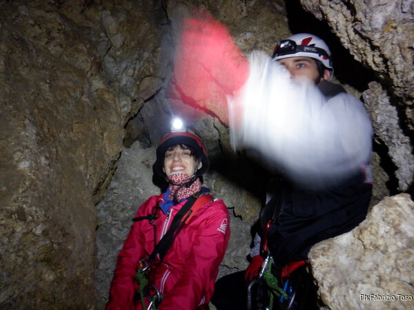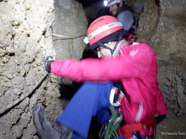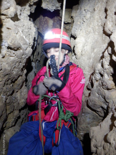 Quando la corda e’ libera iniziano a scendere i nostri novelli speleo. Mi metto sul bordo del pozzo per far loro una foto ma nel caso di Federica il risultato e’ alquanto deludente.