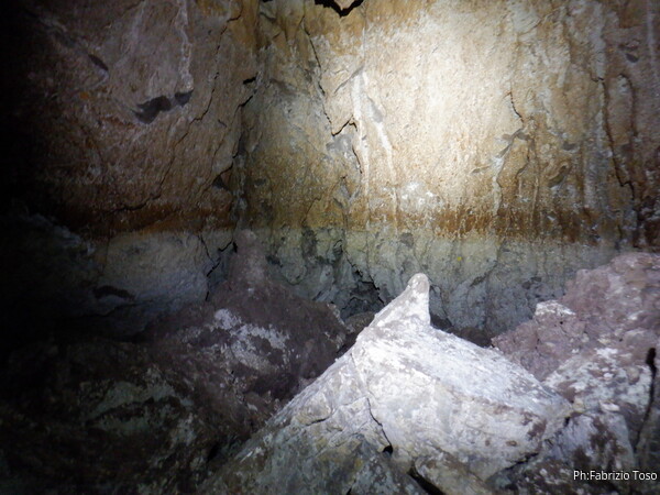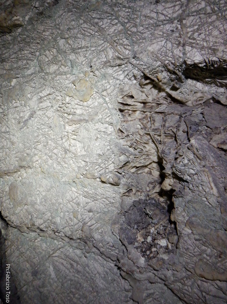 Siamo ora sul plateau inclinato, lo traversiamo mentre descrivo ai miei amici il posto che vedono e alcuni aneddoti che mi sovvengono. Scendiamo per il passaggio fangoso e siamo nella sala del “trivio”. Non credo si chiami ufficialmente cosi’, ma e’ un nome che descrive bene la sala da cui si dipartono almeno 3 meandri. Faccio notare ai miei amici le varie colorazioni della parete che, credo, indicano il livello che aveva l’acqua fino a non troppo tempo fa.