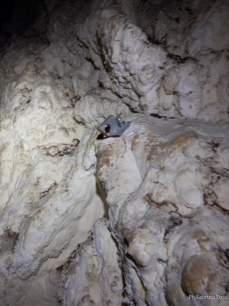Pochi minuti e siamo tutti giu’. Gabriele presenta ai nostri amici la concrezione in cui la sfrenata fantasia dei primi esploratori ha visto la proboscide di un elefante. Fatte le presentazioni, proseguiamo lungo il meandro, verso la strettoia.