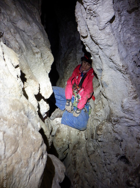 Giusto il tempo di arrivare a mettermi seduto che Luca urla la libera. Decidiamo che e’ meglio che salga io dopo di lui. Gabriele vuole rimanere ultimo per disarmare. Quando arrivo in cima al pozzo trovo Luca che riposa poco piu’ avanti.