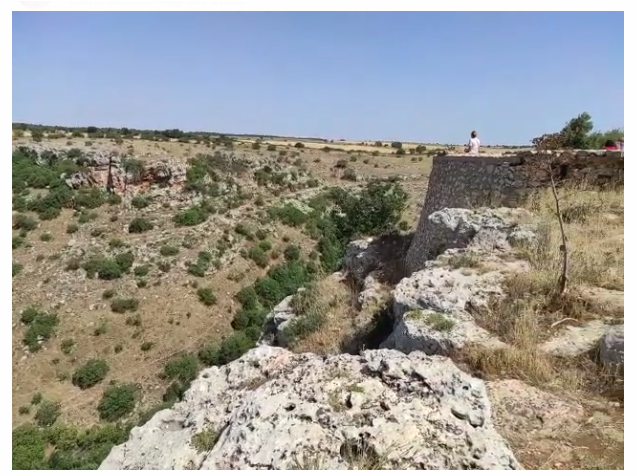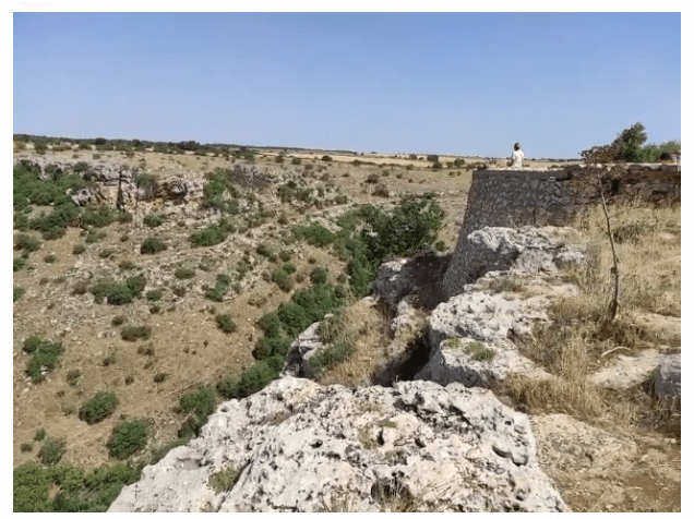 Dopo qualche chiacchiera di saluto decidiamo come passare la mattinata, che si preannuncia molto calda. Per prima cosa andremo al Pulo di Altamura aggregandoci ad un gruppetto di persone guidate da Antonio. Prendo a bordo Giuseppe come guida e facciamo una bella fila di macchine su una strada ben polverosa. In breve siamo allo spiazzo dove lasciamo le macchine per ammirare il Pulo dall’alto. Si tratta di una immensa dolina, Antonio ci dice che probabilmente si e’ formata col crollo della volta di un enorme ambiente ipogeo. Sul fondo della dolina serpeggia una spaccatura che la attraversa da parte a parte. Ancora Antonio, il nostro cicerone, ci dice che sul lato destro, alla fine della spaccatura c’e’ un inghiottitoio con un pozzo di circa 30m. Non andremo a visitarlo perche’ non abbiamo l’attrezzatura, pero’ e’ bello saperlo. Ci spostiamo pero’ a vedere un paio di grotte che si vedono sul bordo della dolina, proprio di fronte a noi. Pensavo saremmo andati a piedi ma visto il caldo la nostra guidaci indica di prendere le macchine per avvicinarci il piu’ possibile.